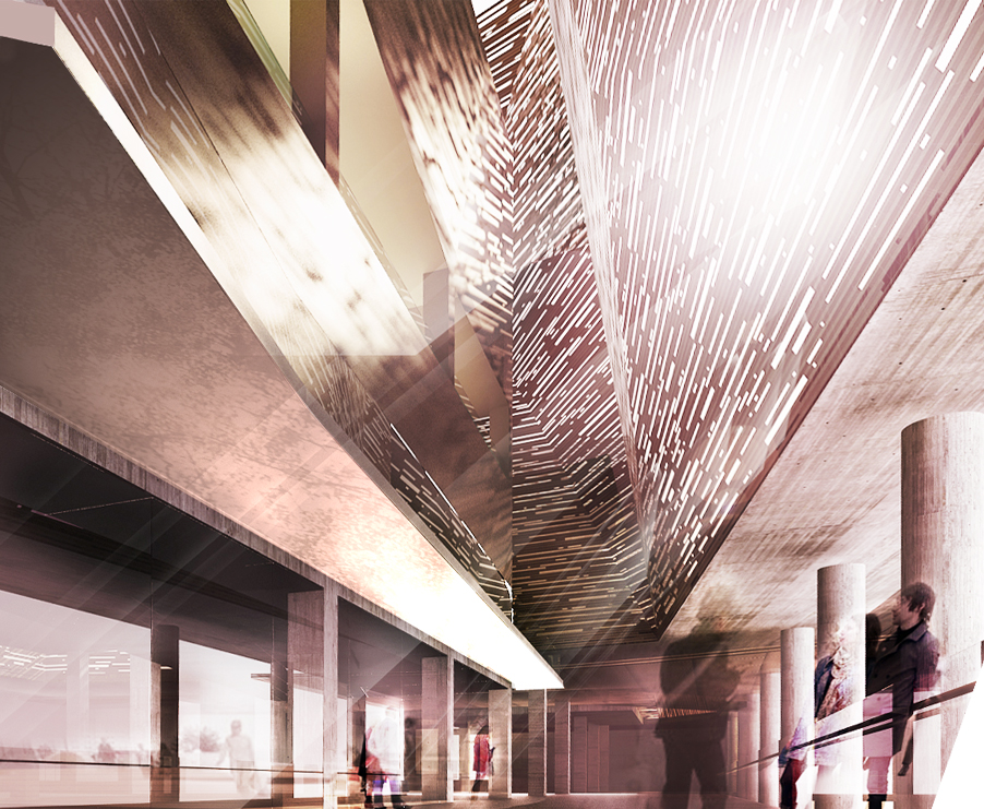 With the architectural design the integration of the building with the urban environment has been aimed and breaking the paries, allowing the pedestrian circulation to continue inside and the middle of the building, evenmore on the green cover designed as an inclined platform, placing a part of nature, an interior landscape in the center, even if it is also man-made, instead of a stimulative fiction have been proposed.