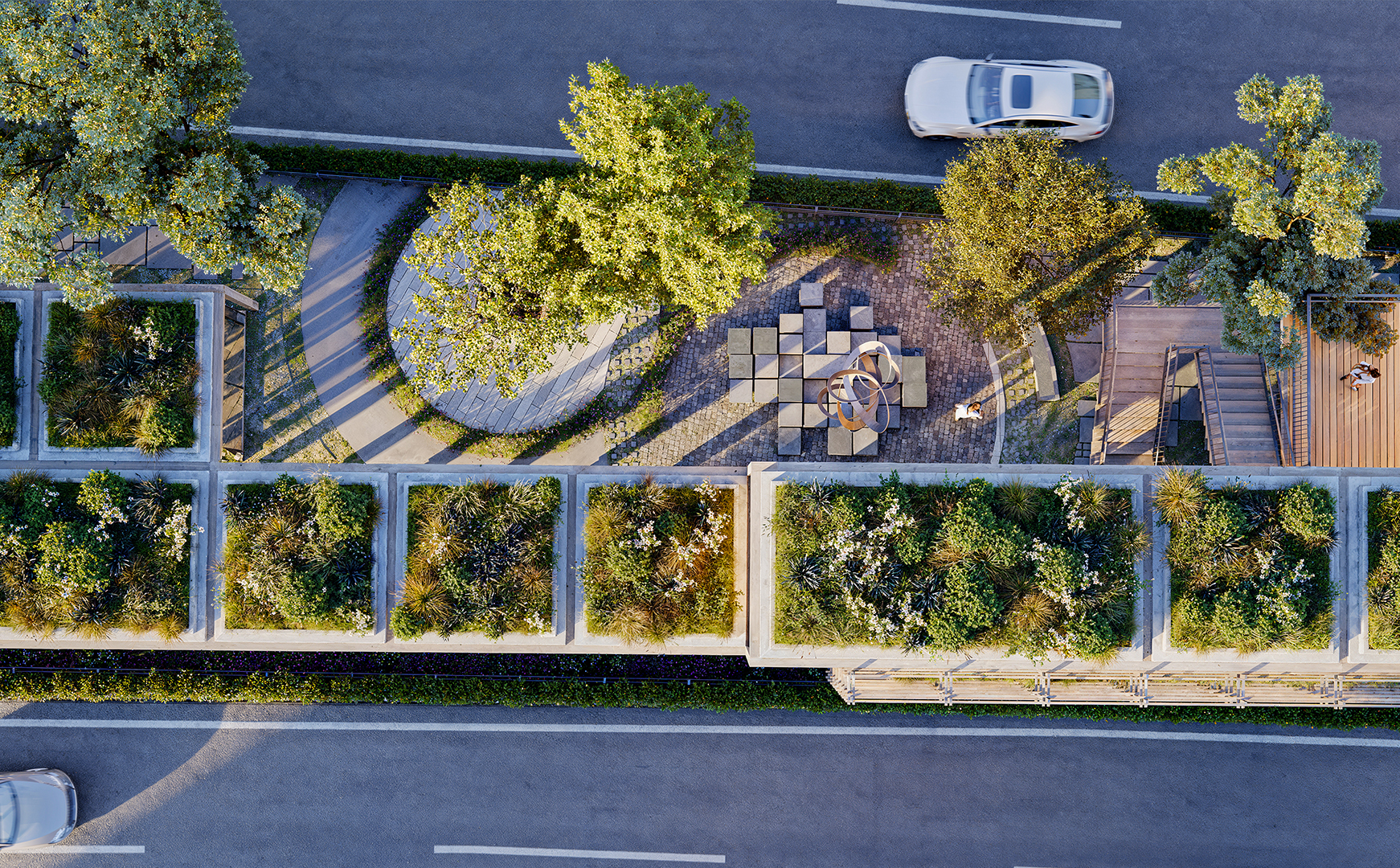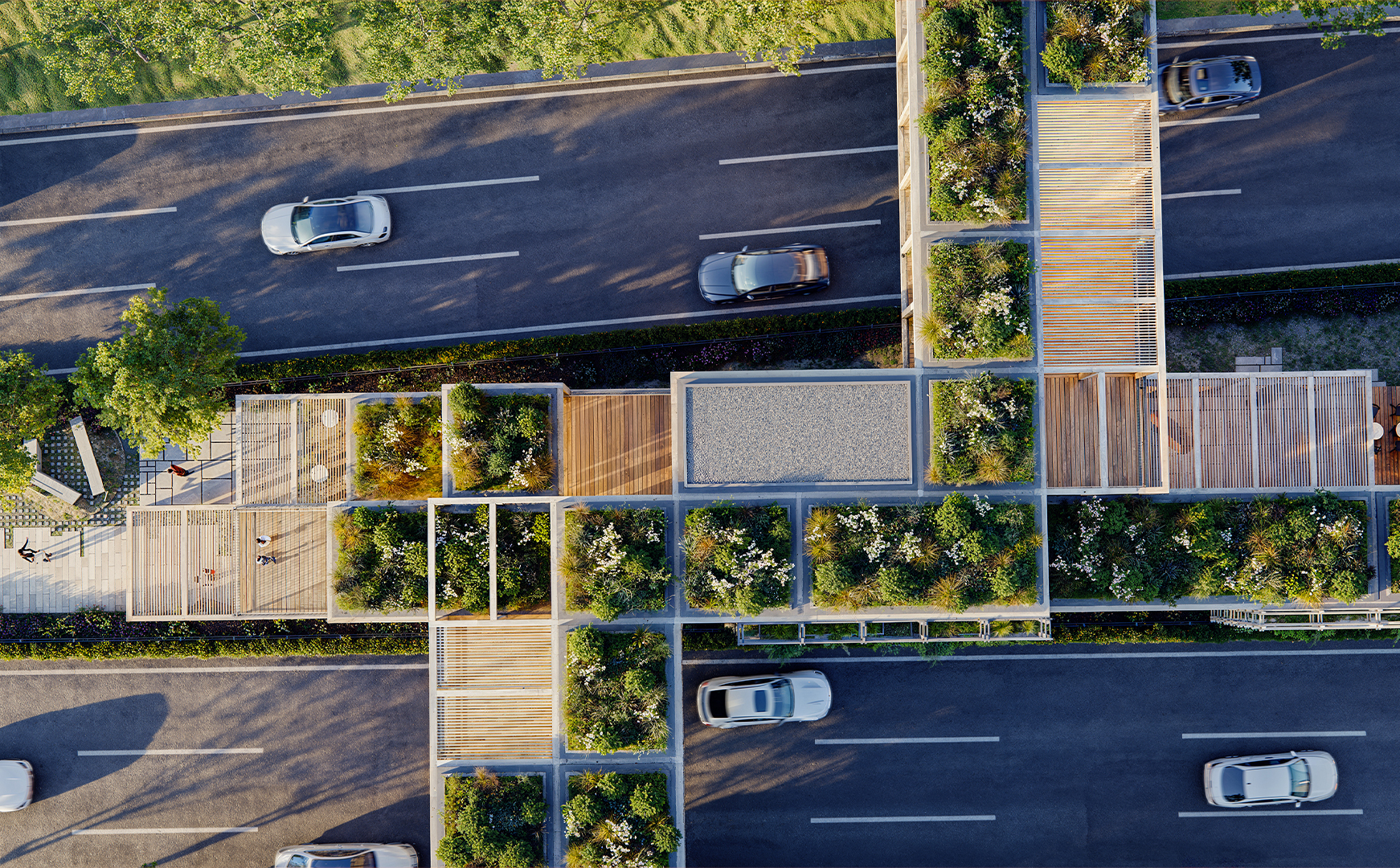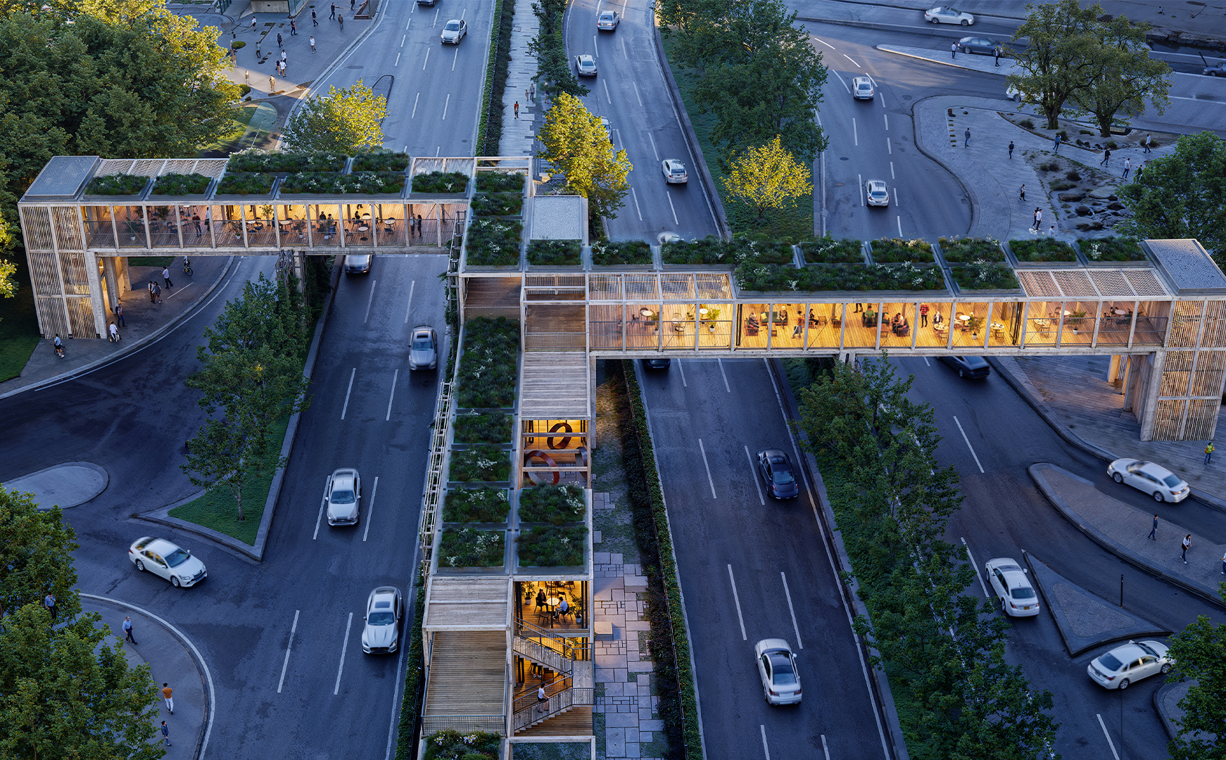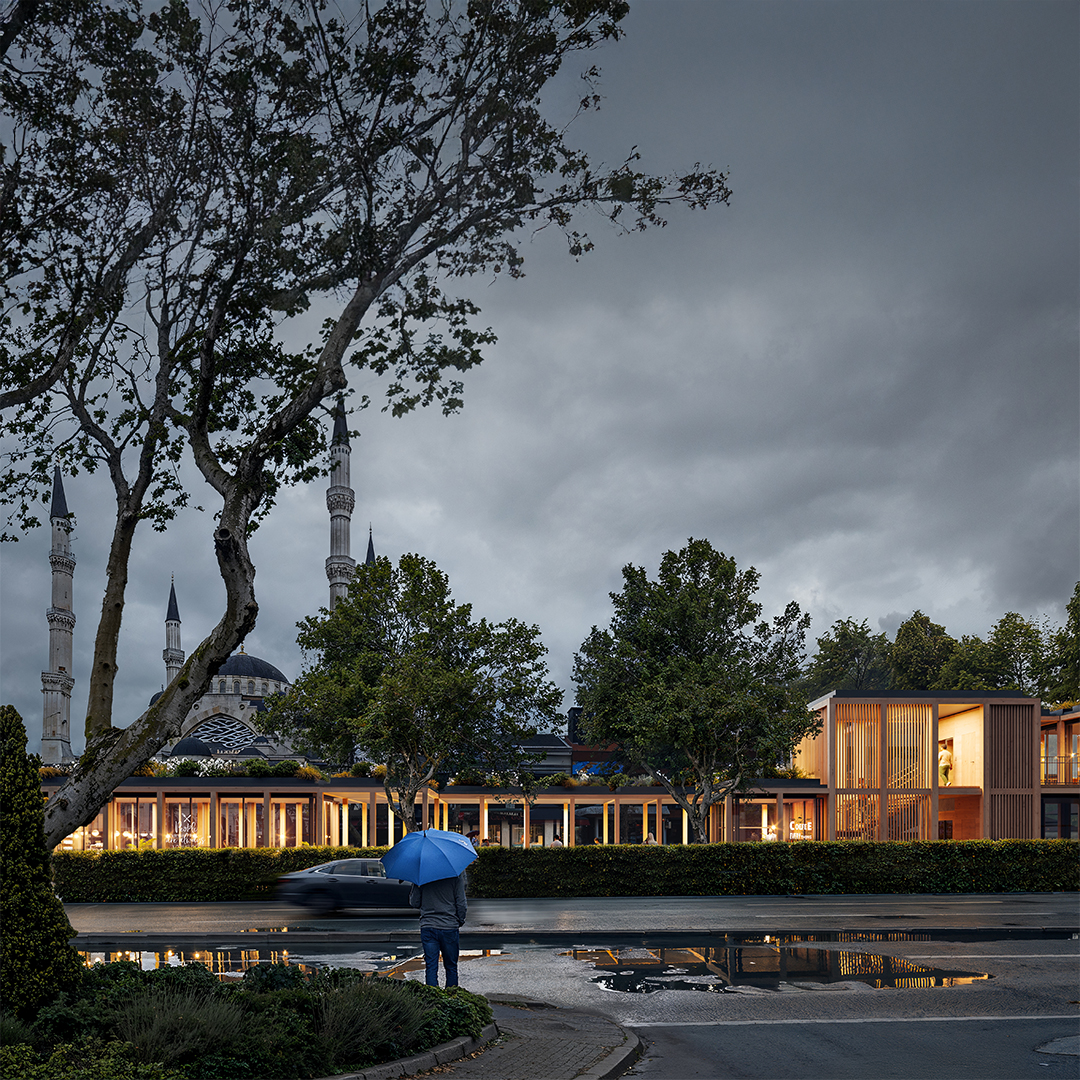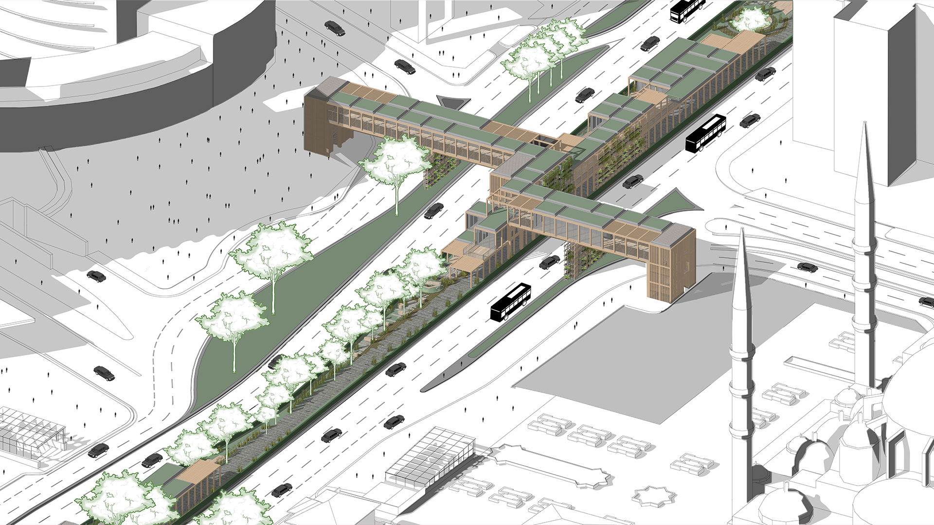 In this context, initially, the idea was to utilize the areas extending parallel to the street on both sides, which, despite being municipal property, are quite inefficient and unusable. The existing road routes were shifted towards these areas. Thus, a new, linear, and uninterrupted pedestrian path with an average width of about fifteen meters was produced between the separated roads. In this area, equipped with various services and cultural functions, a modular structural wooden framework was constructed. Enclosed, semi-enclosed, and open spaces, where the basic needs of users can be met, were integrated with a rich landscape texture. The approximately one-kilometer-long space was connected with pedestrian areas on the east and west sides of the road. In this context, both overpasses and underground connection points, incorporating the surrounding metro lines, were designed.