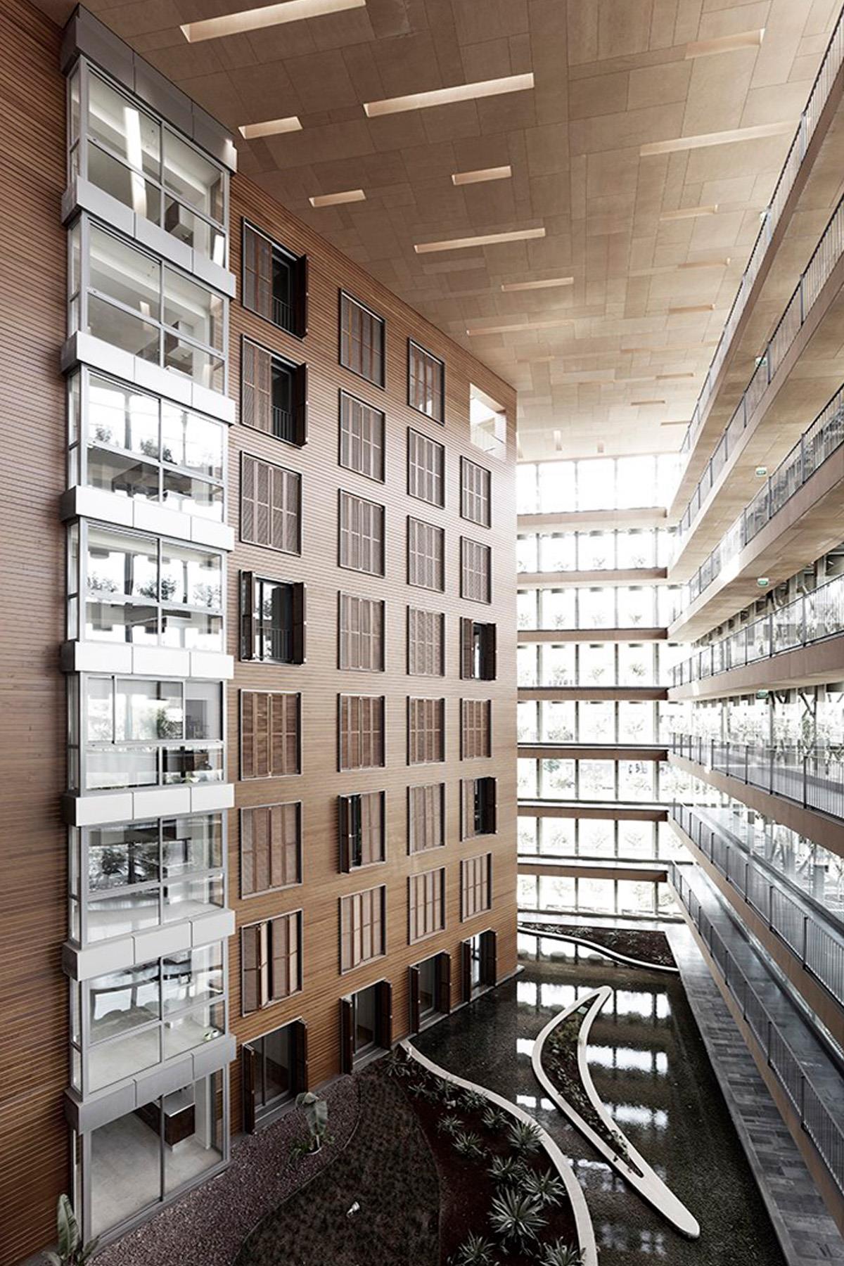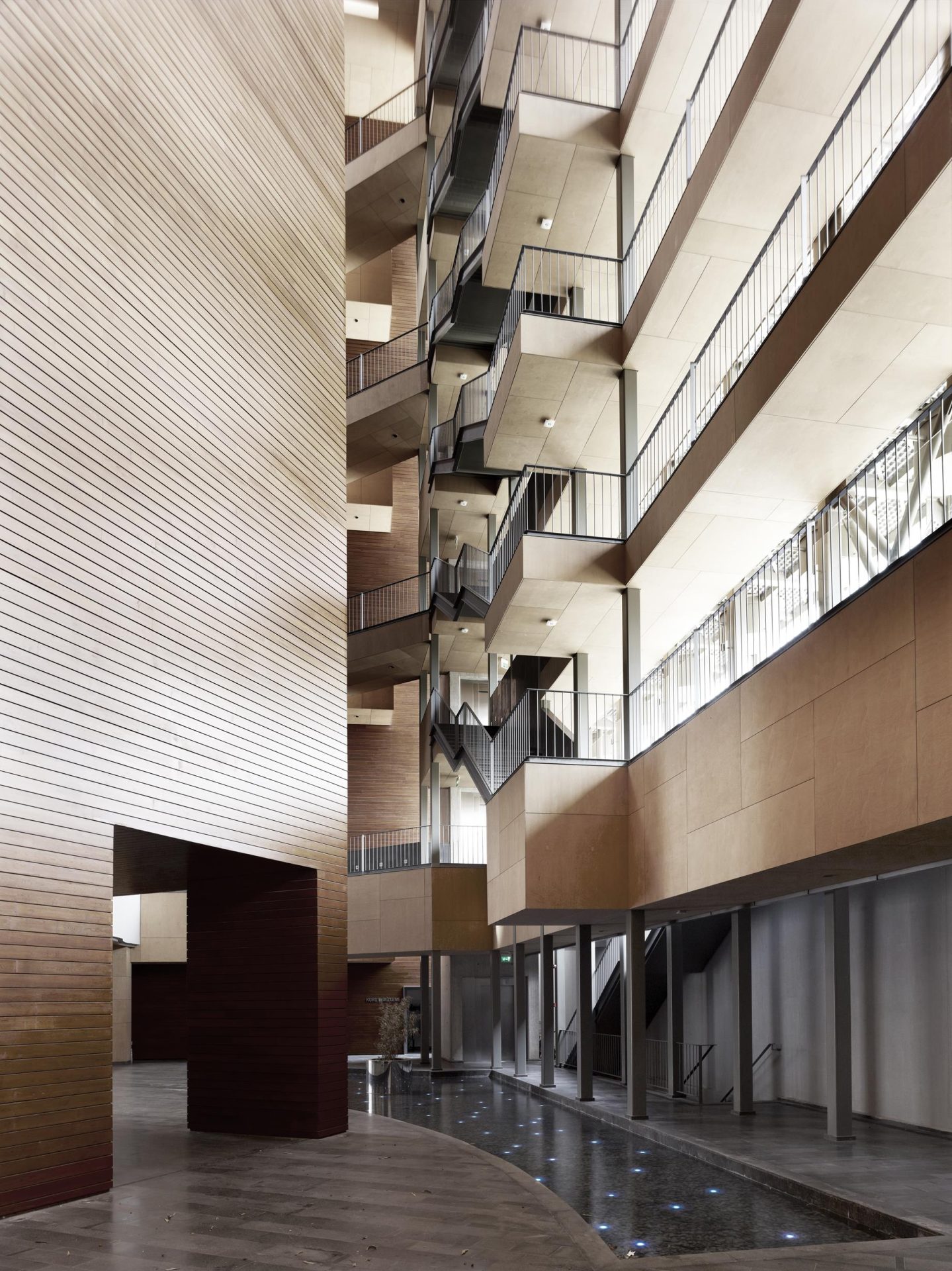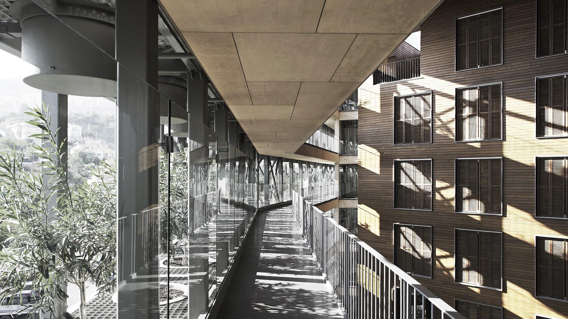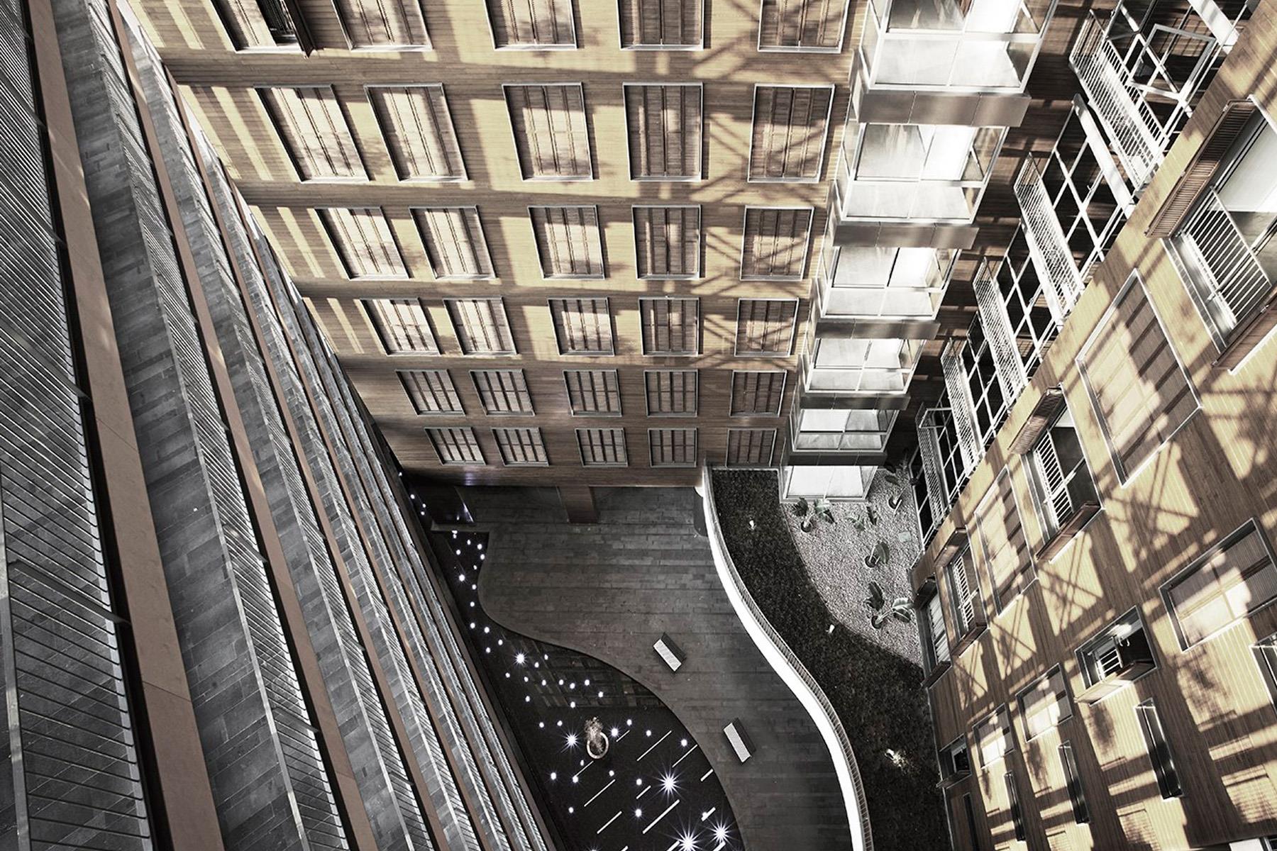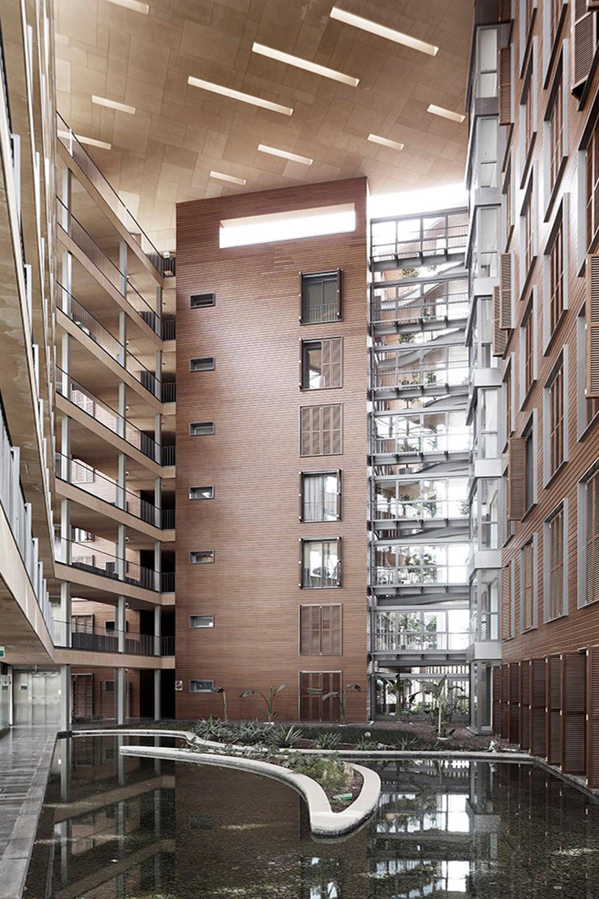 Inner spaces, which replace apartment hallways, feature a light roof skin that allows improved air circulation and microclimatic effects generated by cooling pools placed within these spaces. Wood, stone, and exposed concrete were used for exterior surfaces with the conviction that these materials will age gracefully in this climate and context.