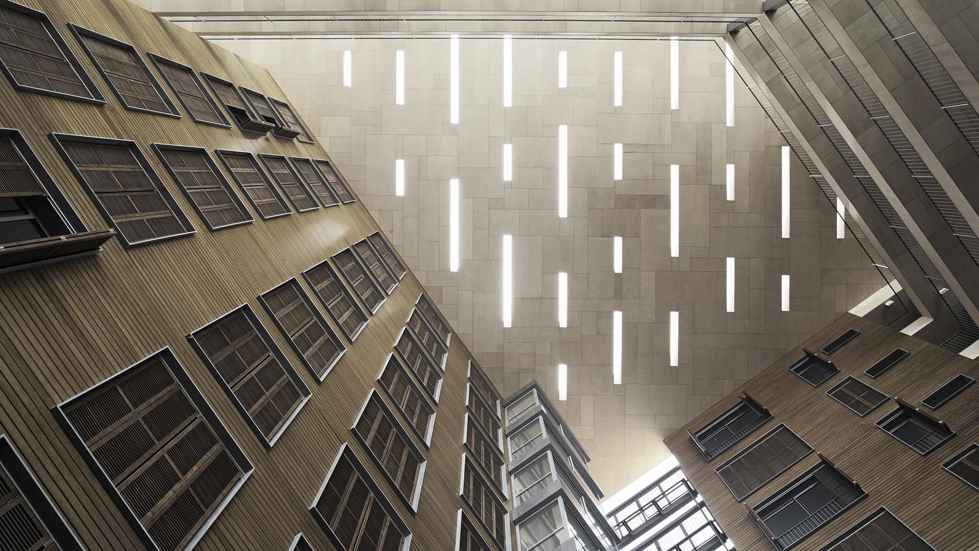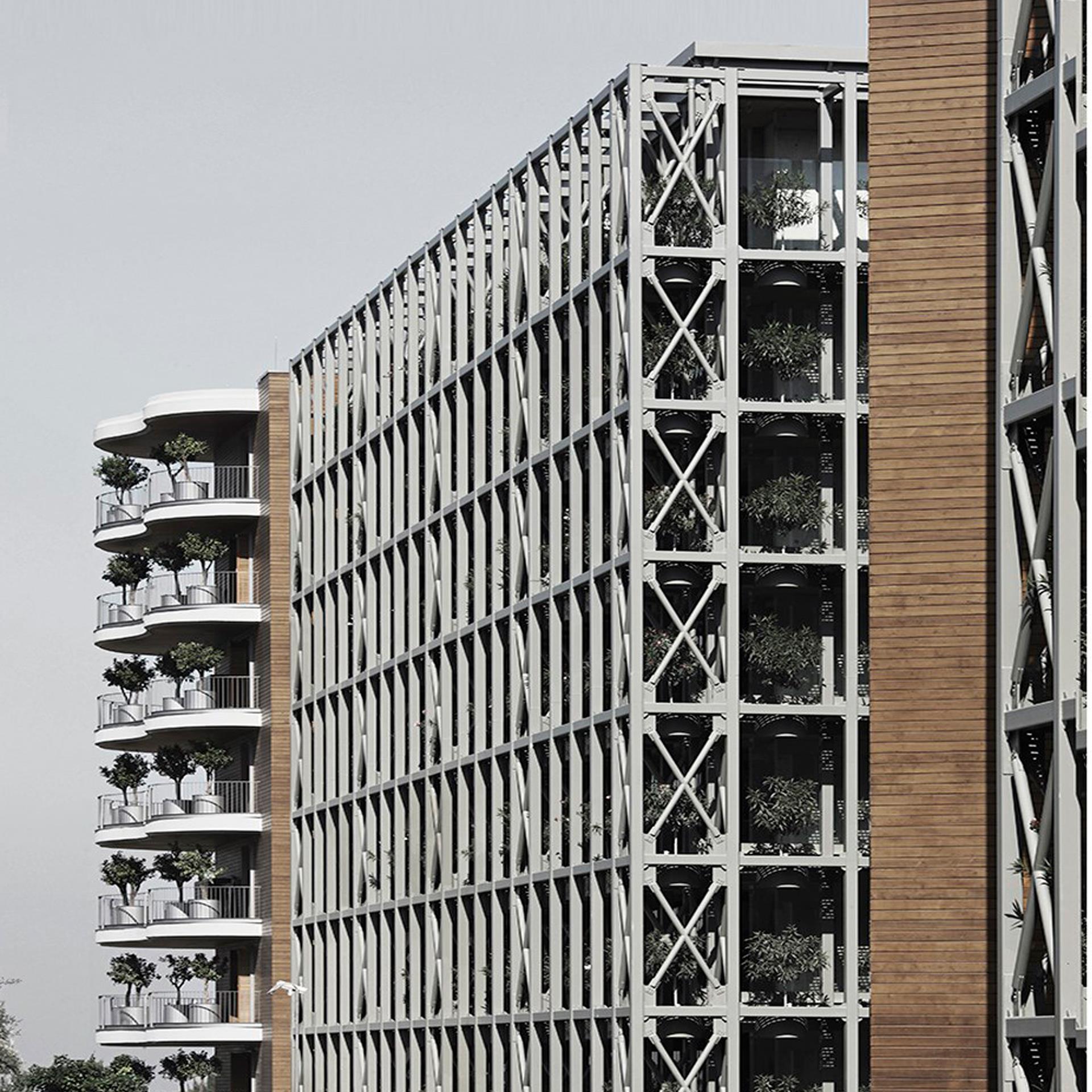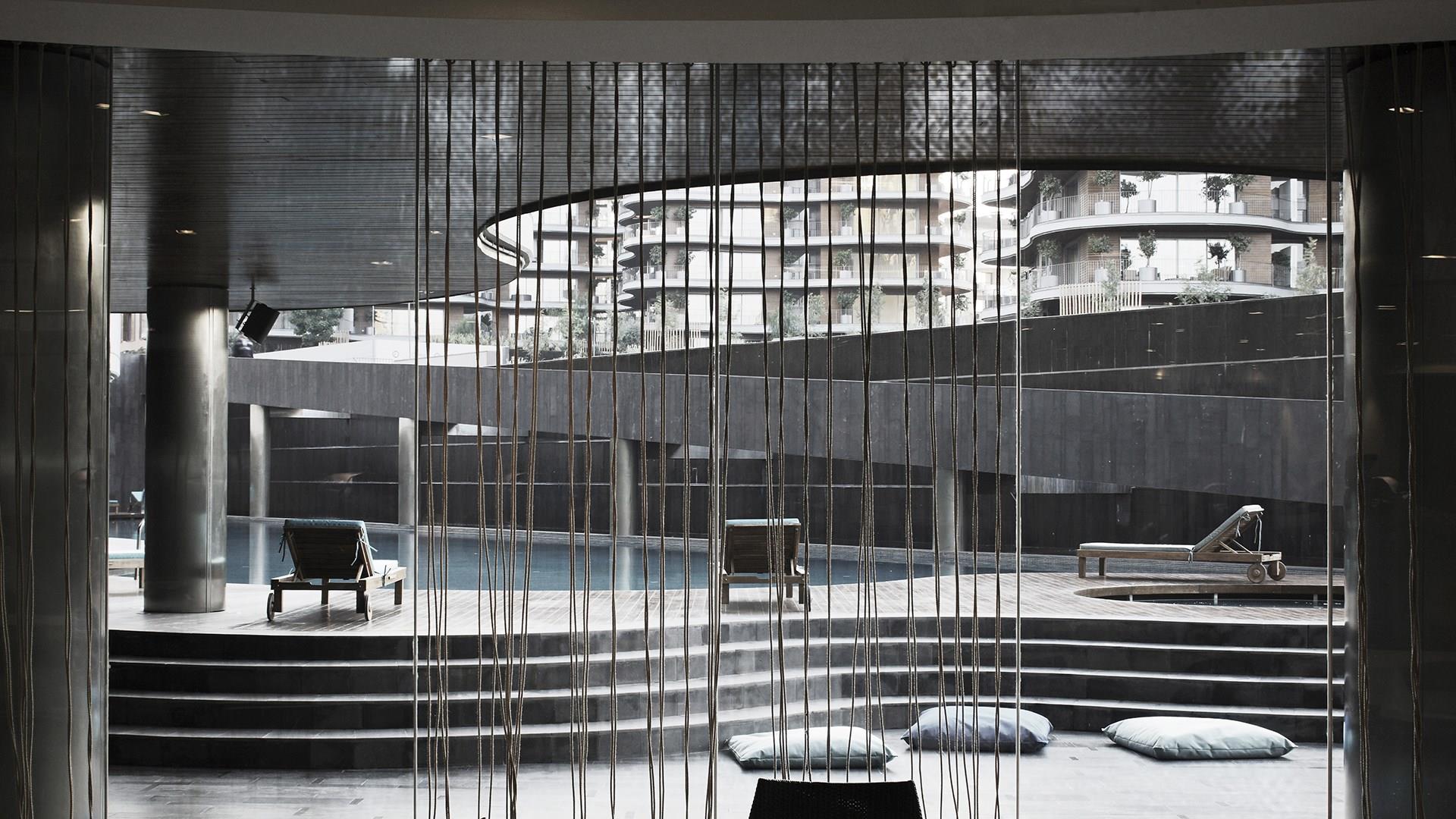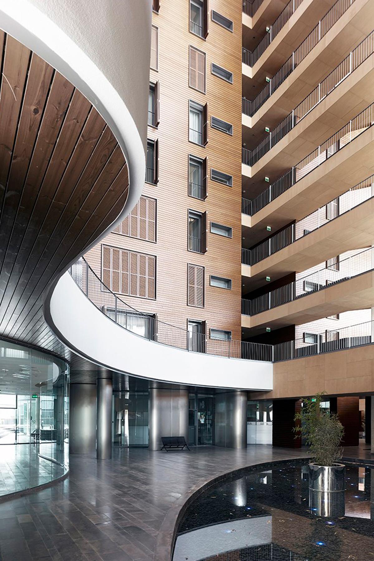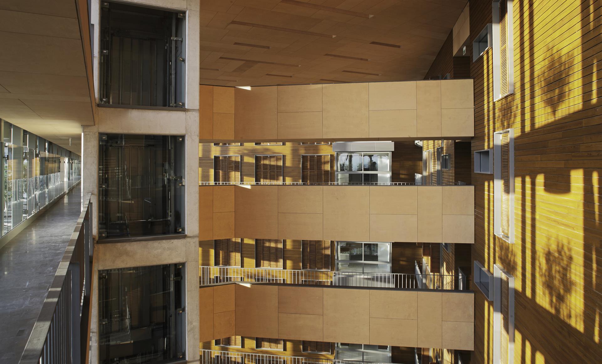 Inner spaces, which replace apartment hallways, feature a light roof skin that allows improved air circulation and microclimatic effects generated by cooling pools placed within these spaces. Wood, stone, and exposed concrete were used for exterior surfaces with the conviction that these materials will age gracefully in this climate and context.