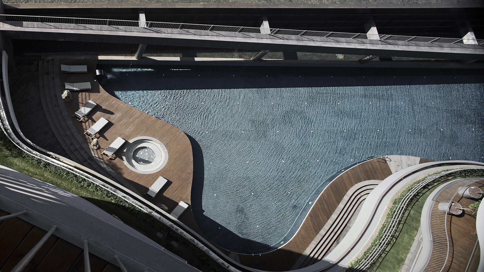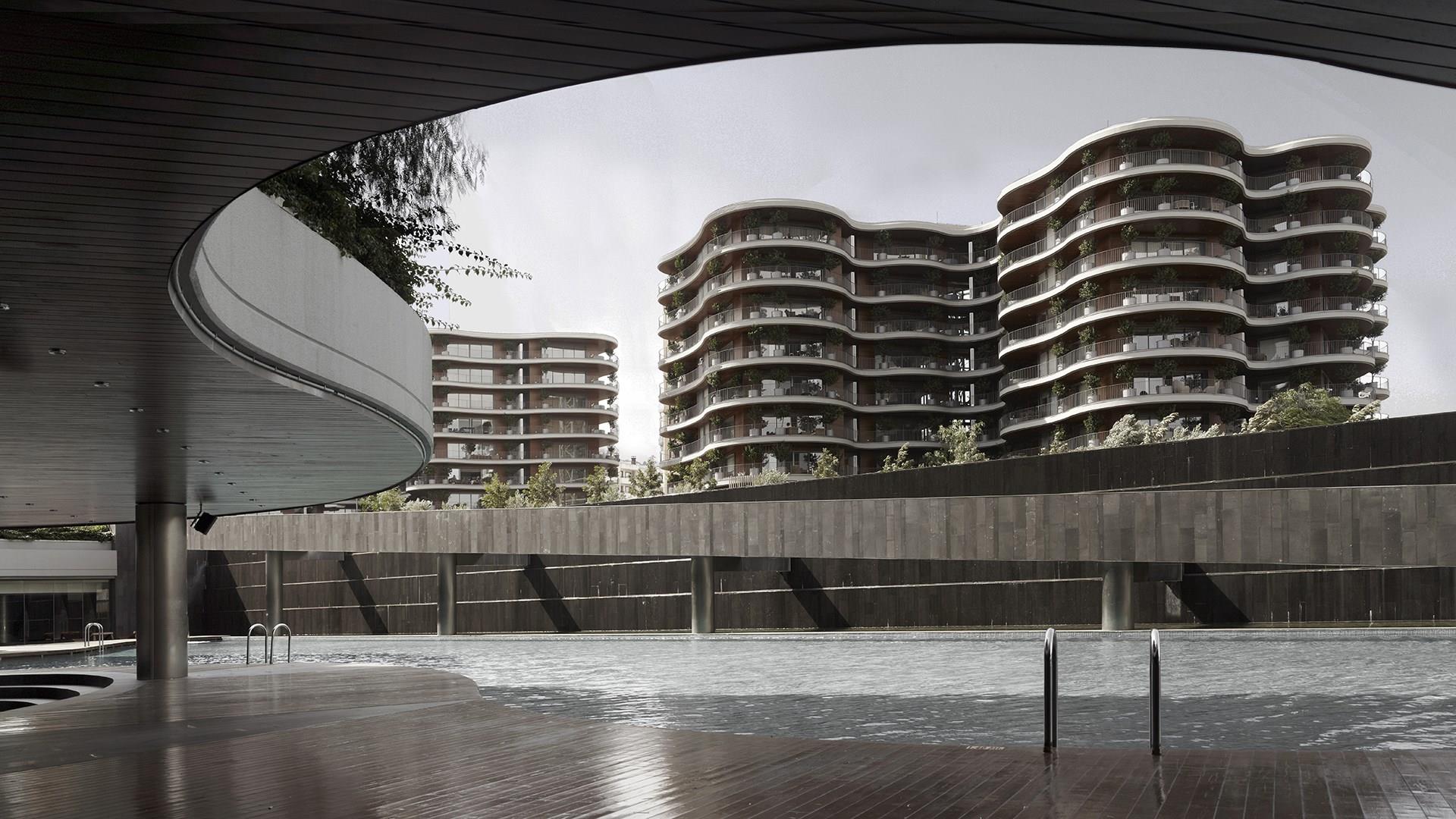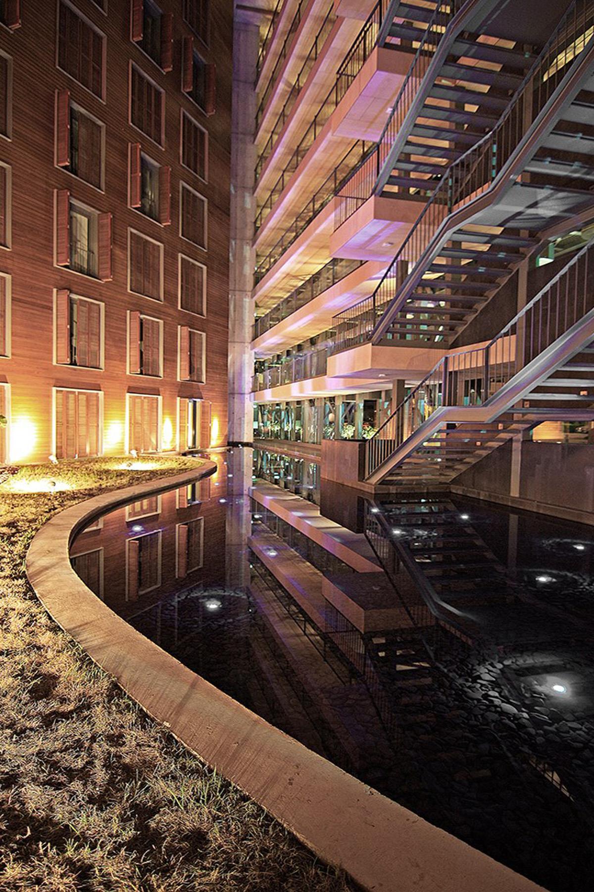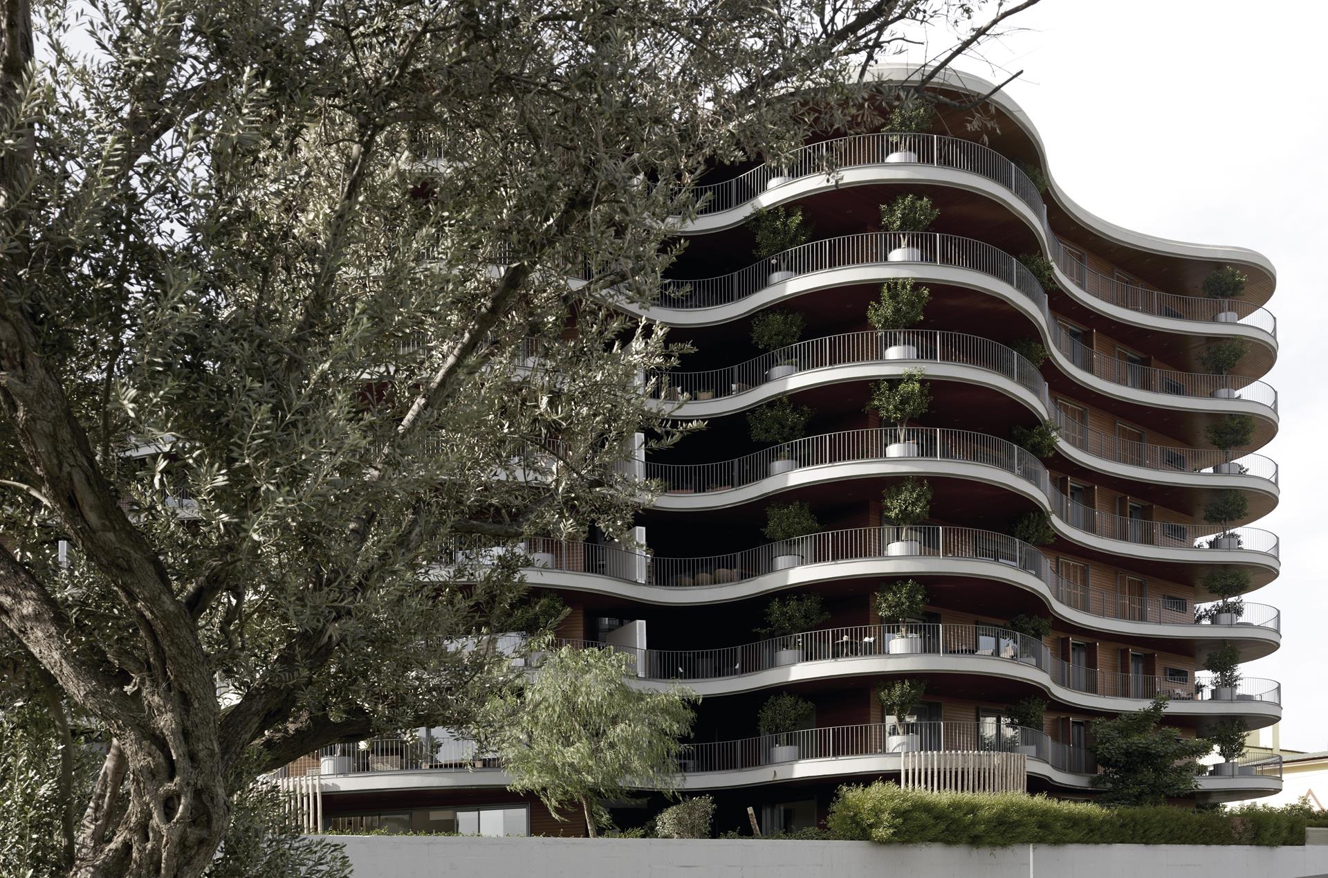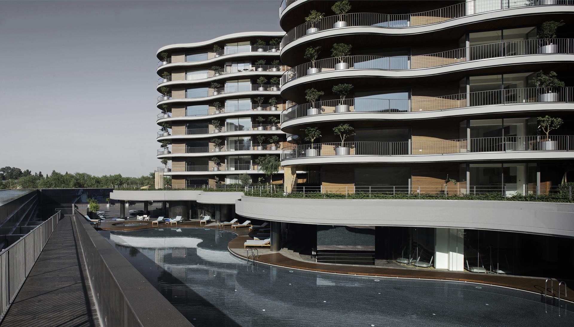 Inner spaces, which replace apartment hallways, feature a light roof skin that allows improved air circulation and microclimatic effects generated by cooling pools placed within these spaces. Wood, stone, and exposed concrete were used for exterior surfaces with the conviction that these materials will age gracefully in this climate and context.