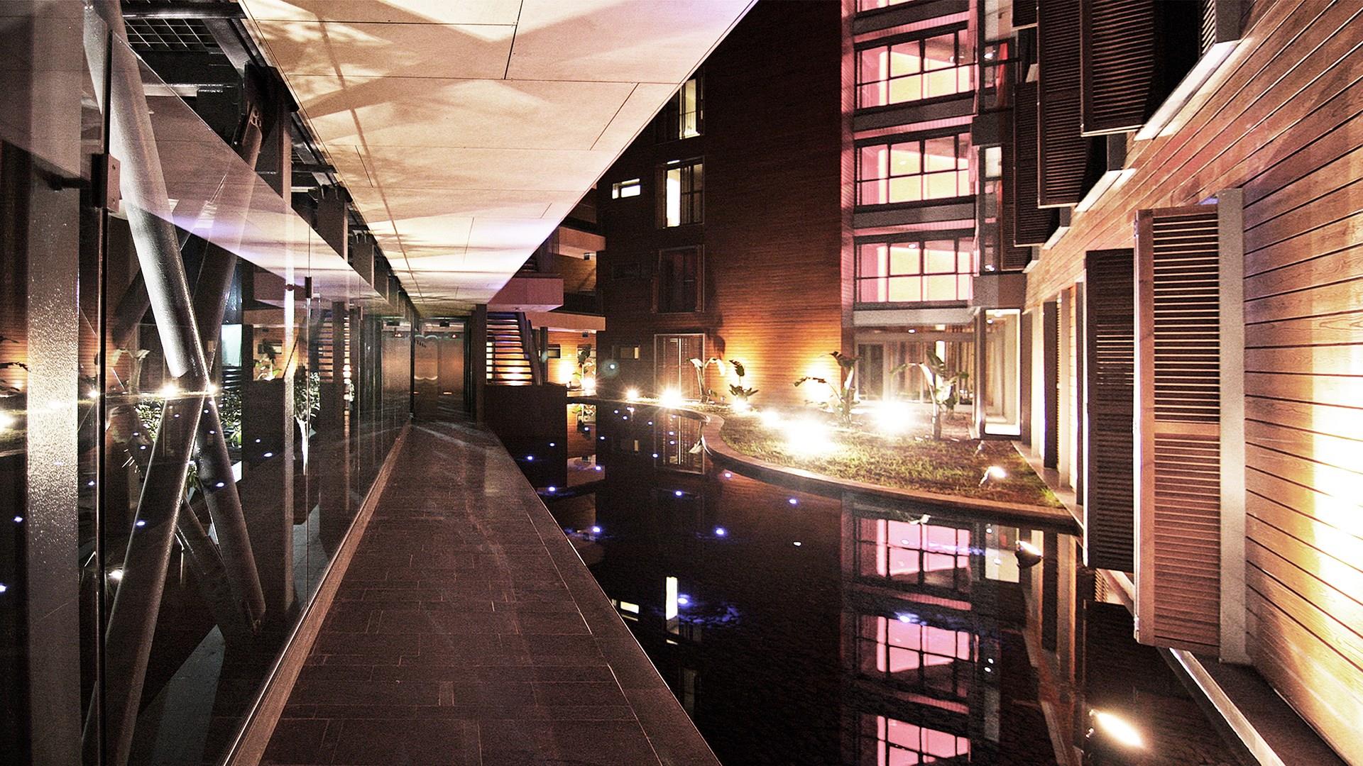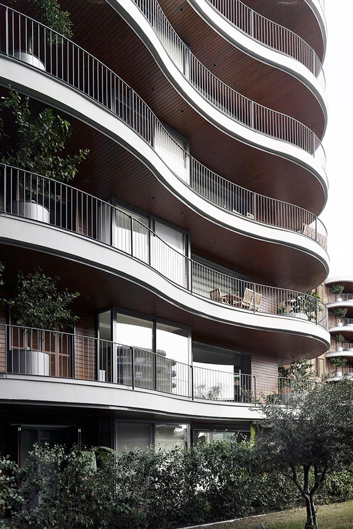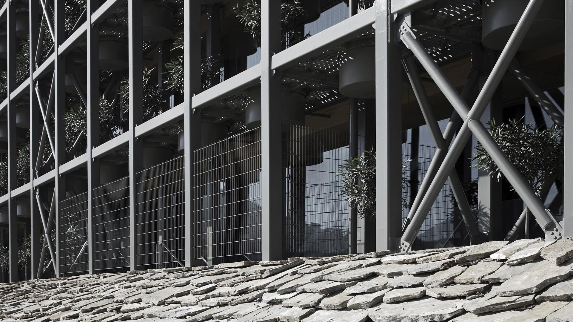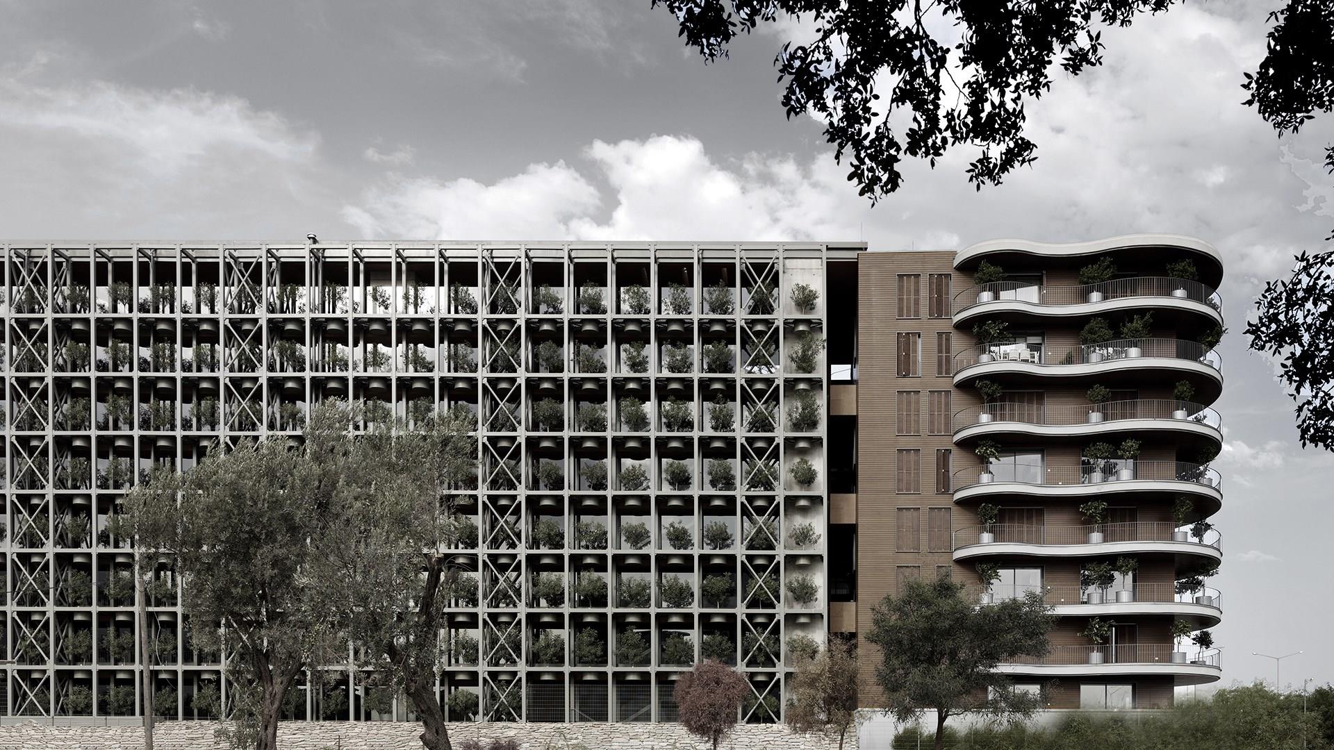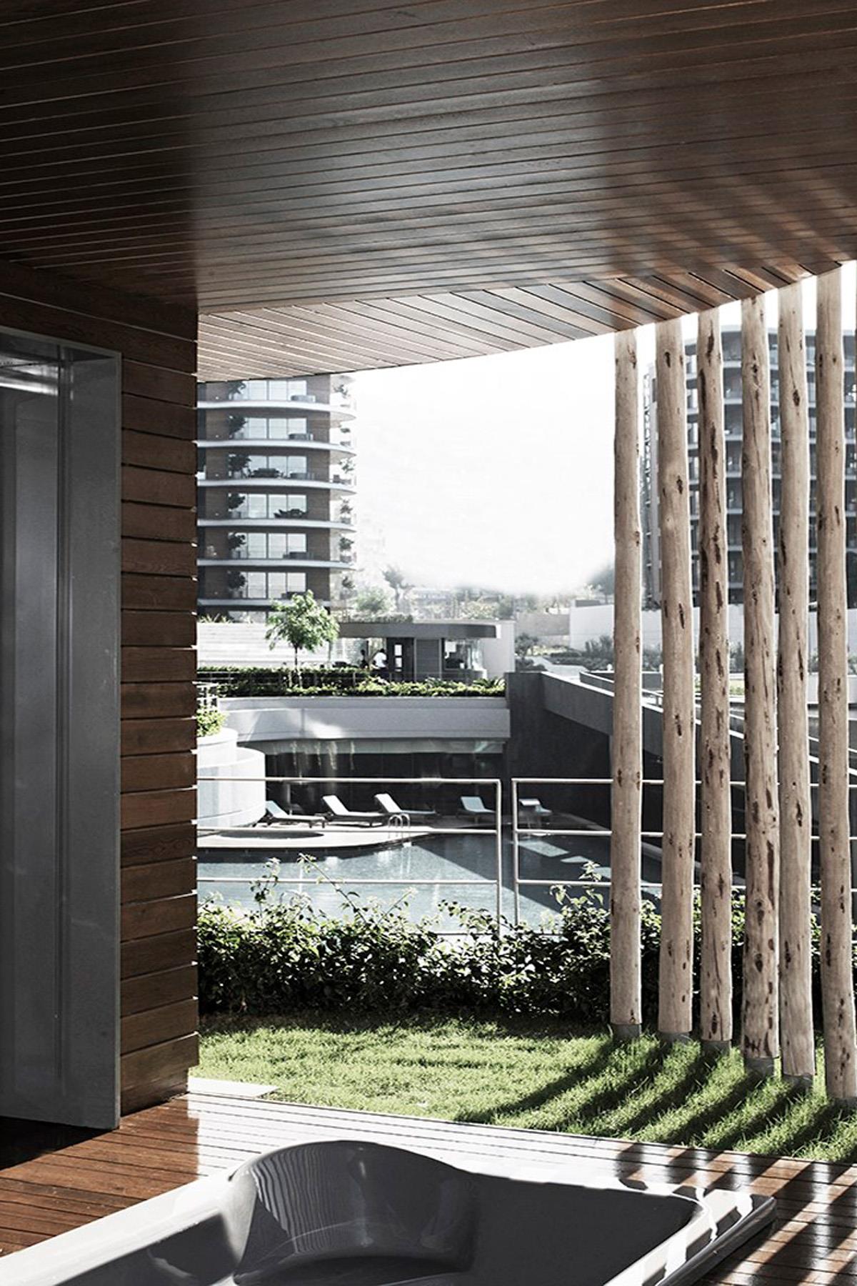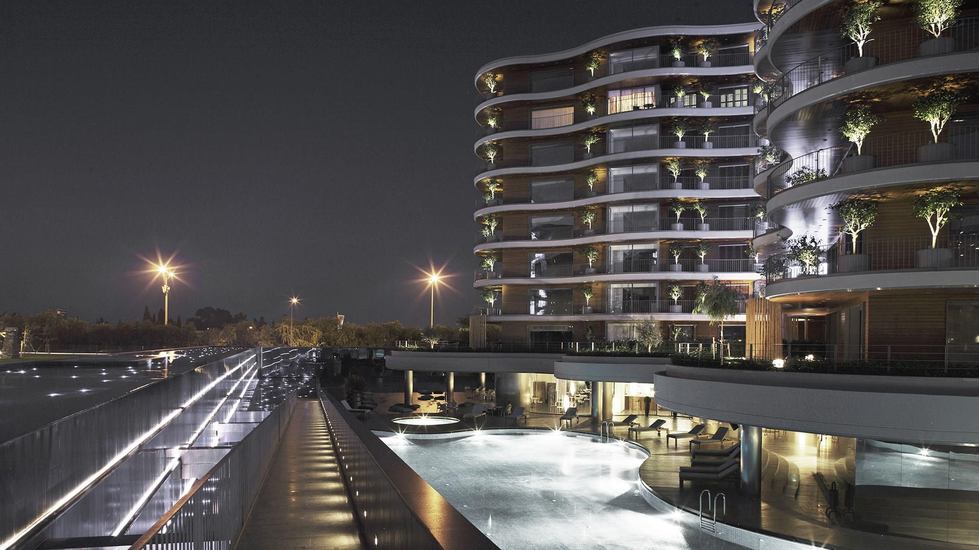 Inner spaces, which replace apartment hallways, feature a light roof skin that allows improved air circulation and microclimatic effects generated by cooling pools placed within these spaces. Wood, stone, and exposed concrete were used for exterior surfaces with the conviction that these materials will age gracefully in this climate and context.
