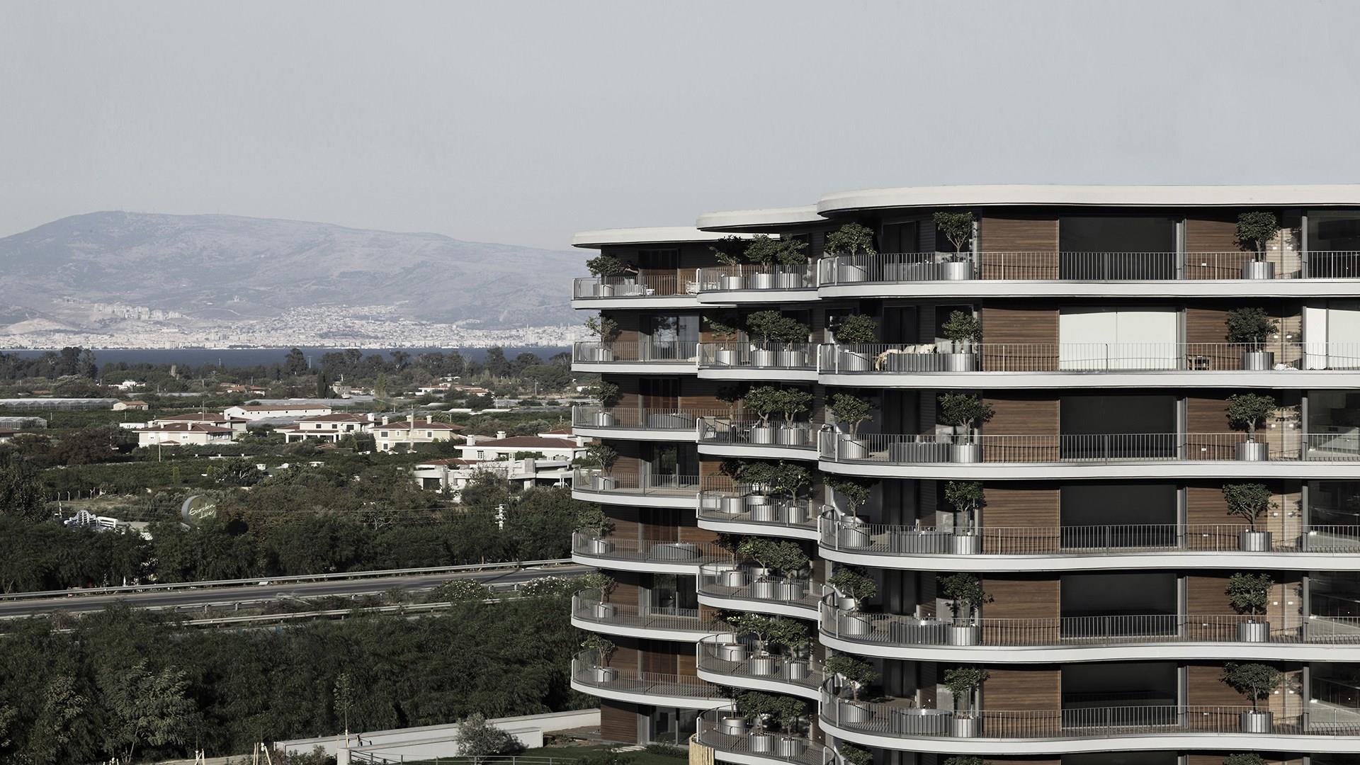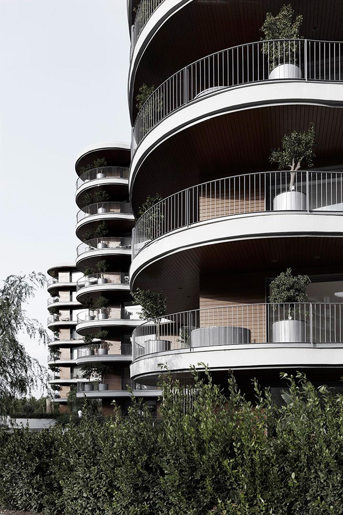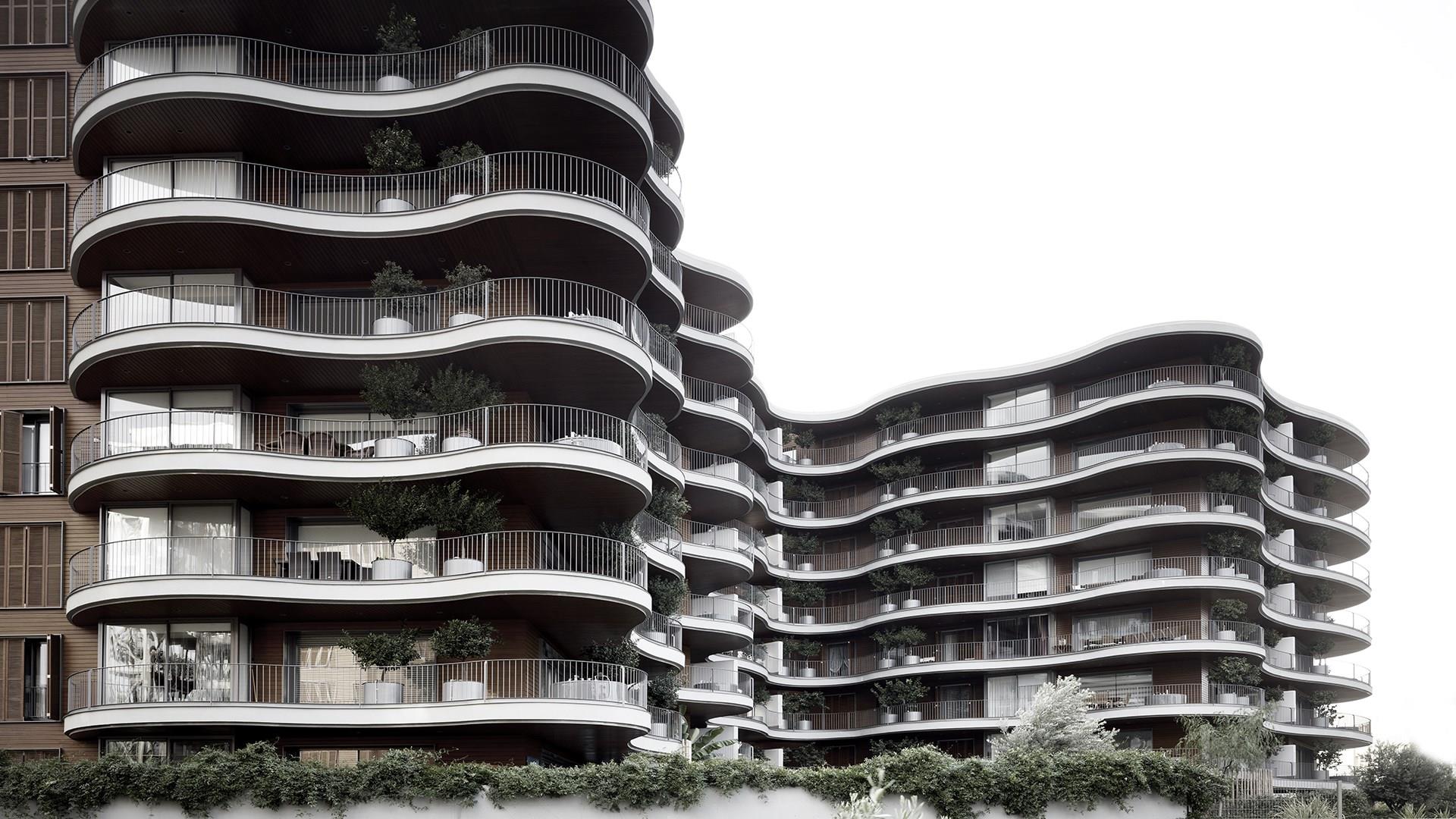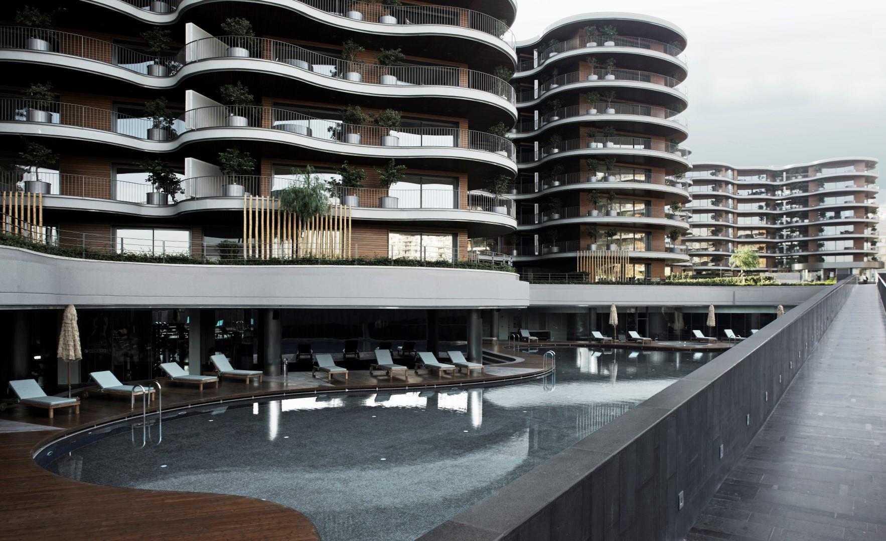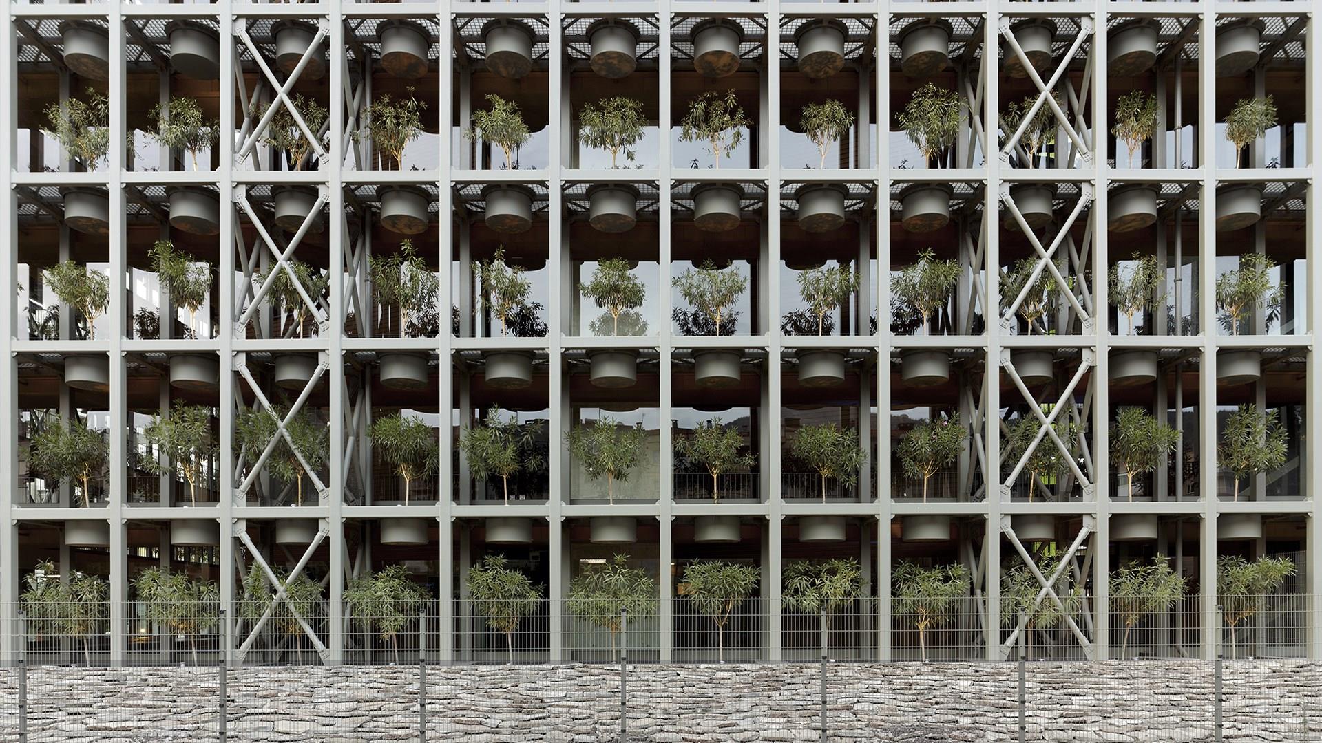 Inner spaces, which replace apartment hallways, feature a light roof skin that allows improved air circulation and microclimatic effects generated by cooling pools placed within these spaces. Wood, stone, and exposed concrete were used for exterior surfaces with the conviction that these materials will age gracefully in this climate and context.