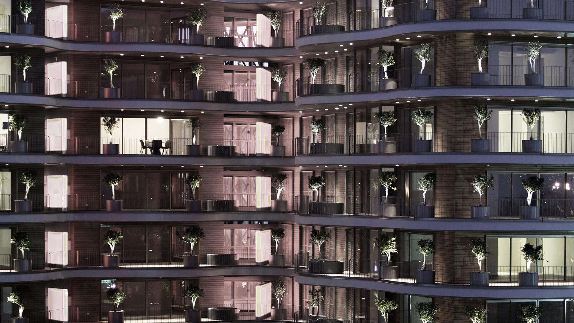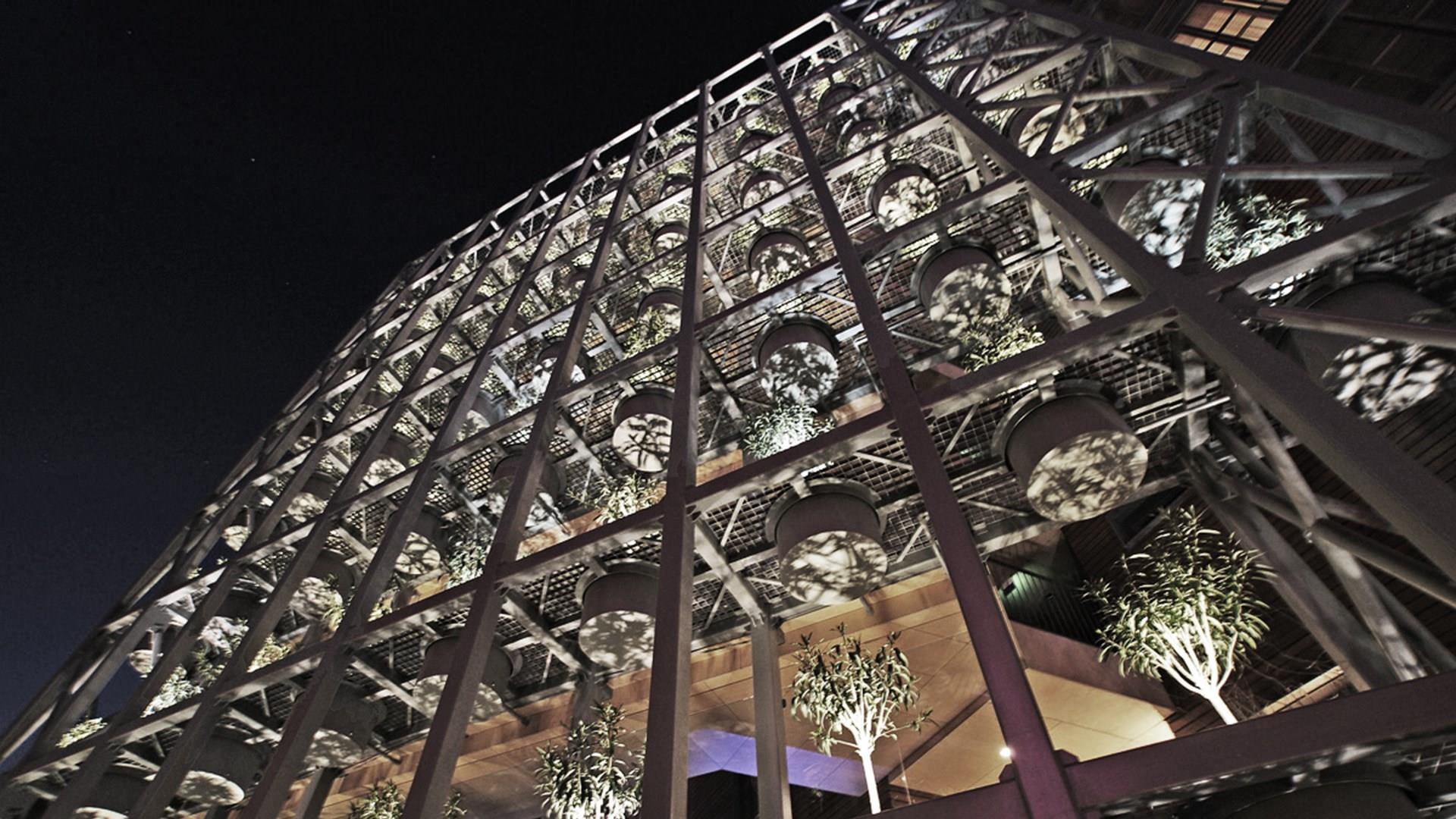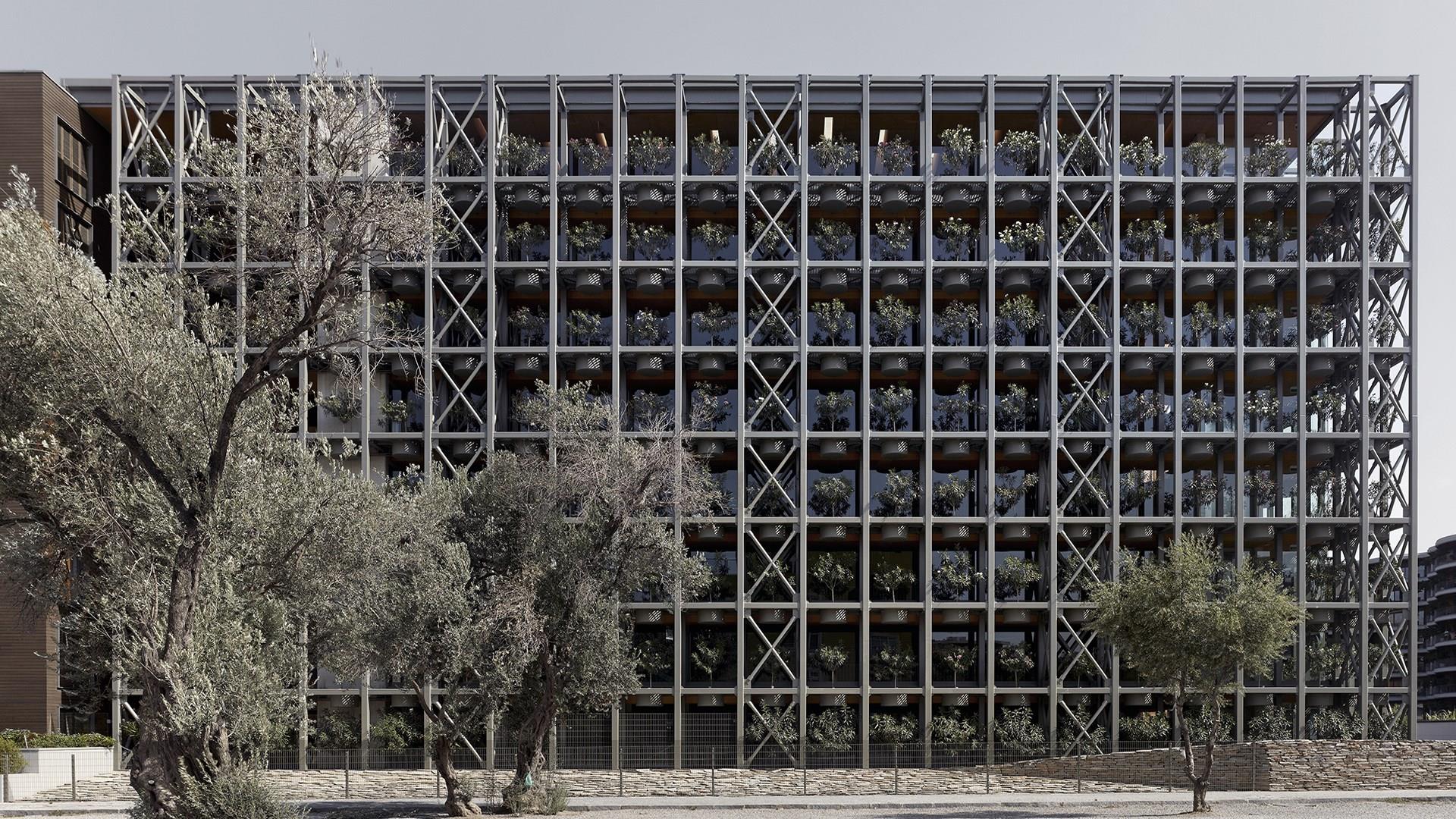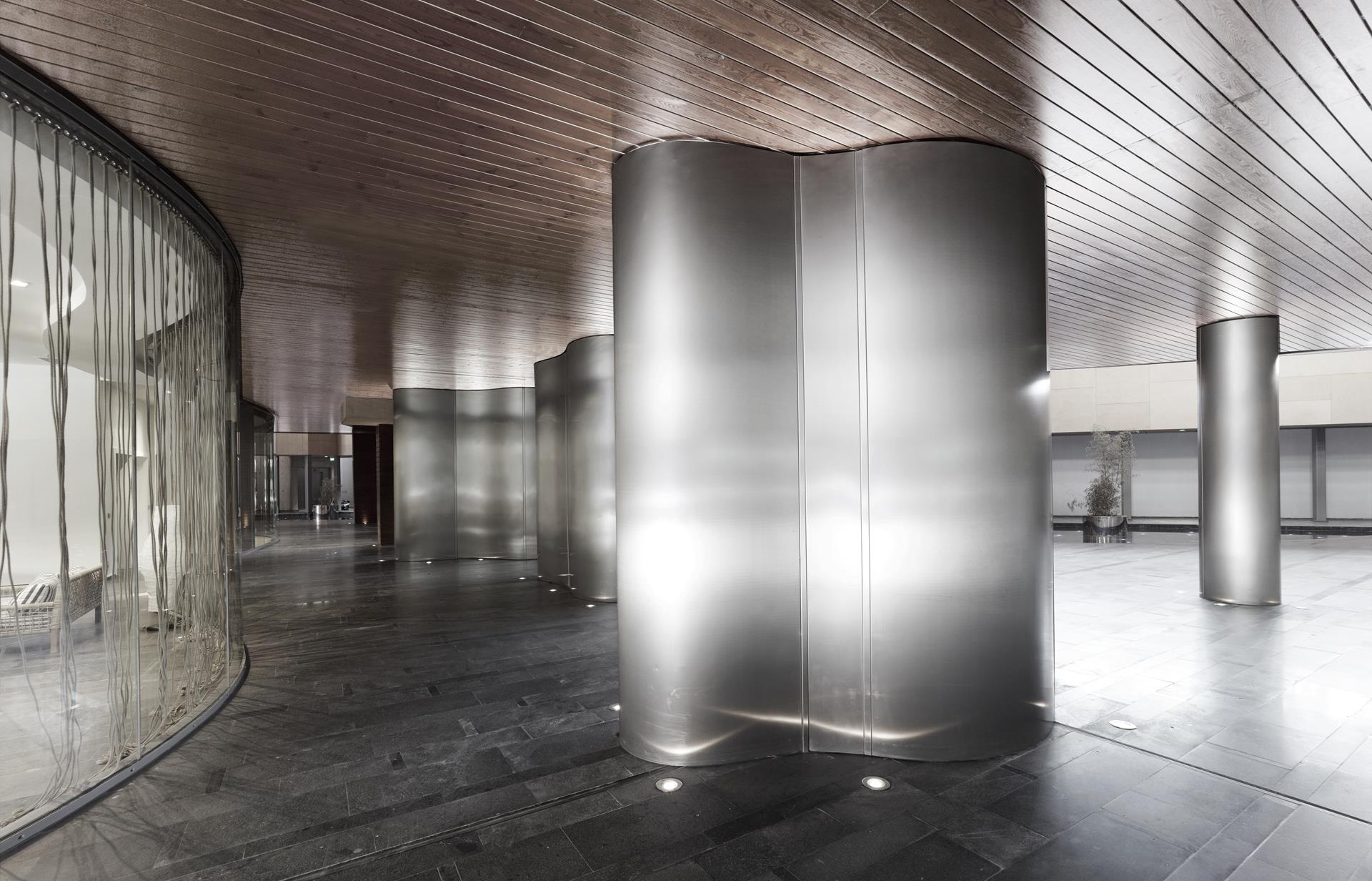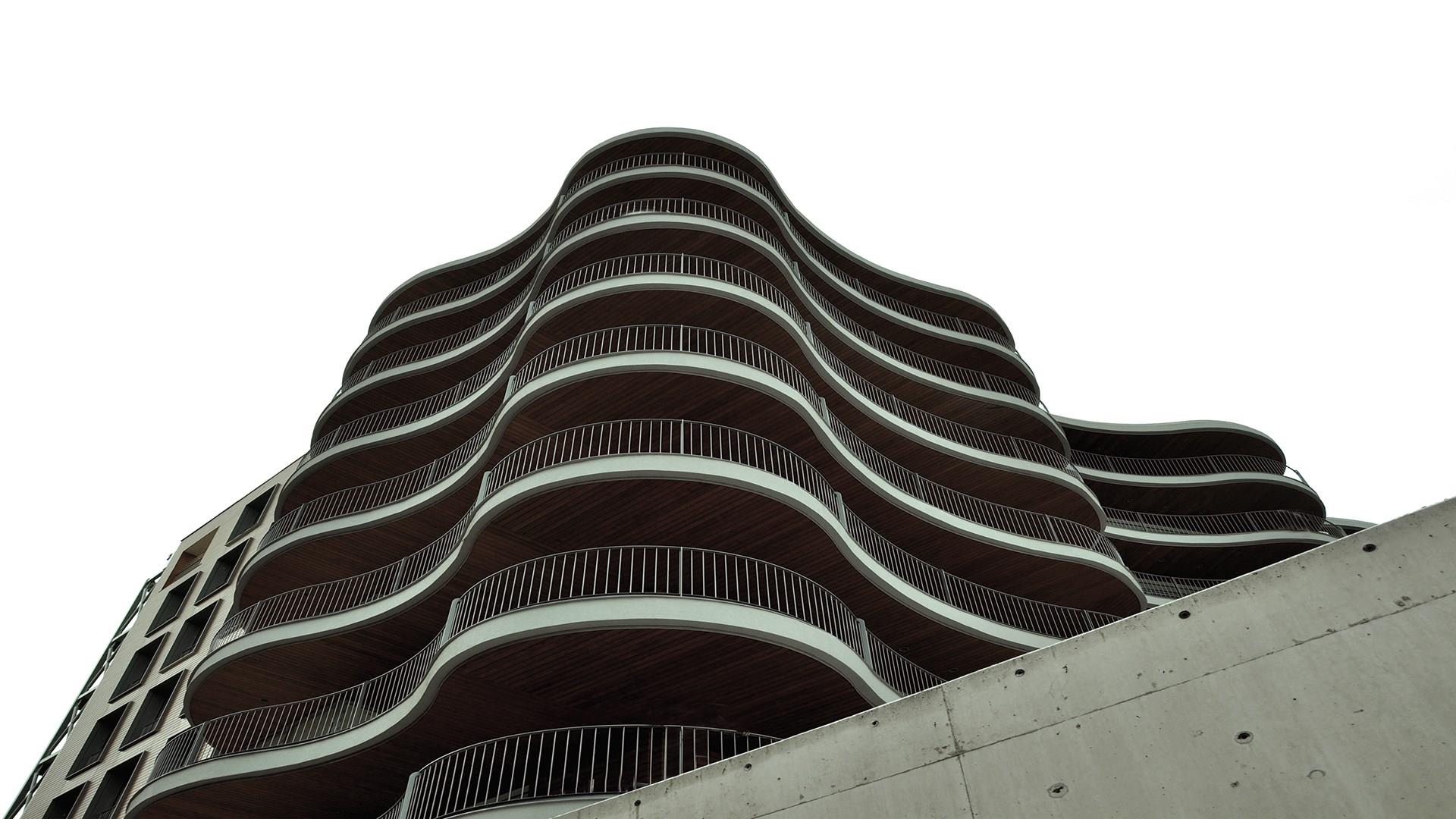 Inner spaces, which replace apartment hallways, feature a light roof skin that allows improved air circulation and microclimatic effects generated by cooling pools placed within these spaces. Wood, stone, and exposed concrete were used for exterior surfaces with the conviction that these materials will age gracefully in this climate and context.