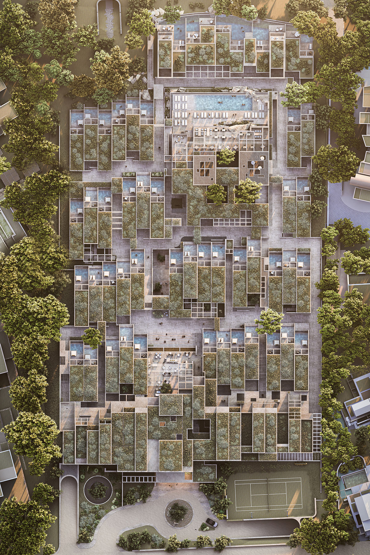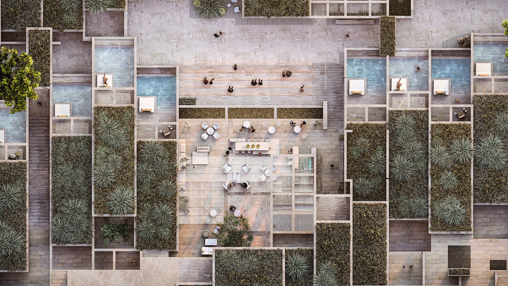 B-Resort, as one of the tourism facilities within Green Coast Village, was designed as a resort that fully incorporates the aforementioned physical characteristics. In this context, different-sized room units arranged as individual masses and other masses forming enclosed communal areas were composed to create meaningful and functional spaces between them. Accessibility, social and ecological sustainability, and uninterrupted pedestrian circulation were prioritized as significant criteria in all stages of the design. In this context, the ground floor of the facility, which is located at different levels, was completely free of car traffic. Shaded pedestrian paths opening towards the sea or oriented perpendicular to it, and small to large squares creating various communal use opportunities at the intersections of these paths, formed the circulation and recreation strategy of the facility. The layered architectural solutions created on the building façades opening towards the sea contributed to the creation of attractive interstitial spaces by softening the boundaries between indoor and outdoor areas. The fragmented massing sustained throughout the building allowed for the design of surprising communal spaces for users. This fragmentation also created the possibility of utilizing the site’s gentle slope as an advantage. The roofs of the masses, considered as a kind of fifth façade, were articulated and largely greened. Thus, a natural ground was provided for views towards the sea from one building over another.