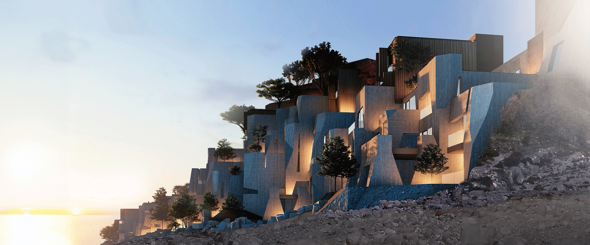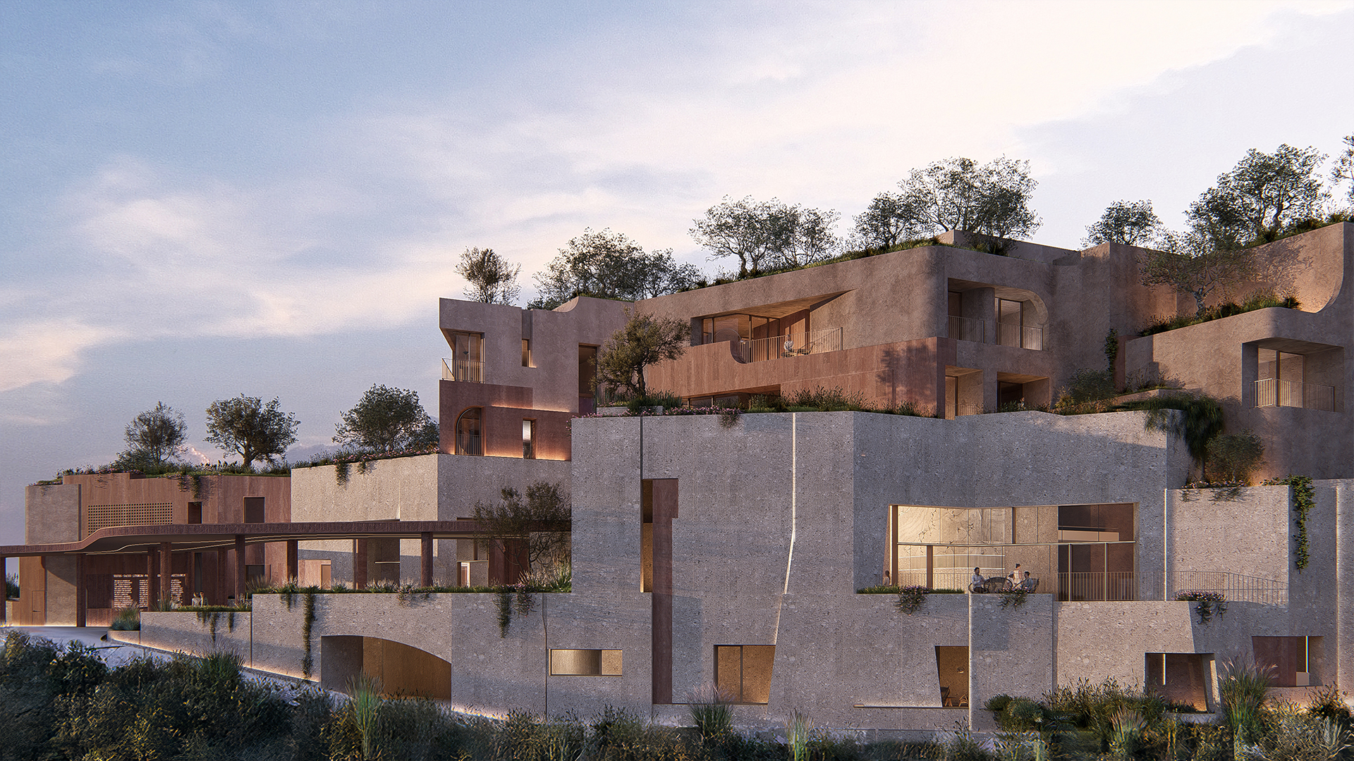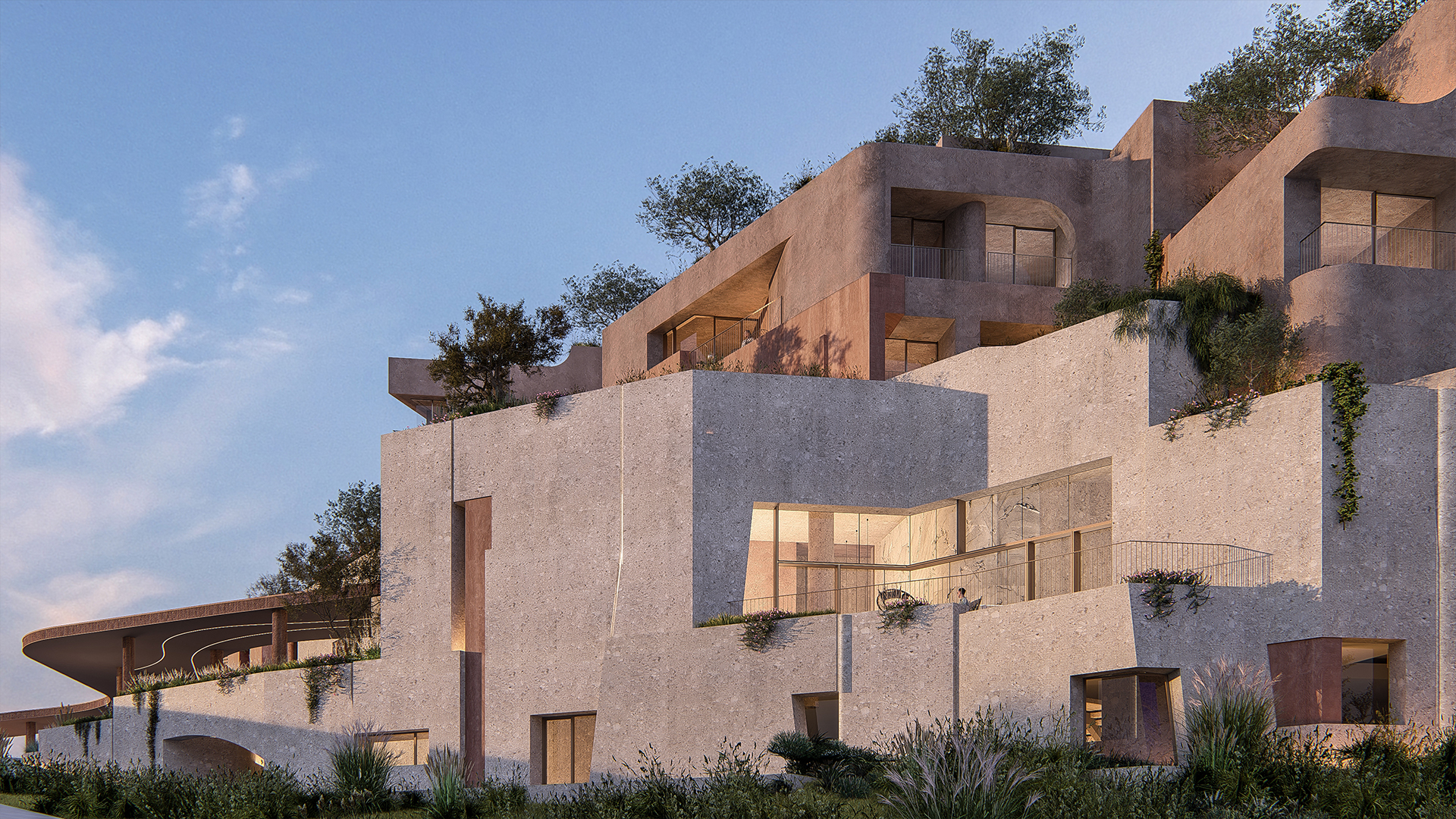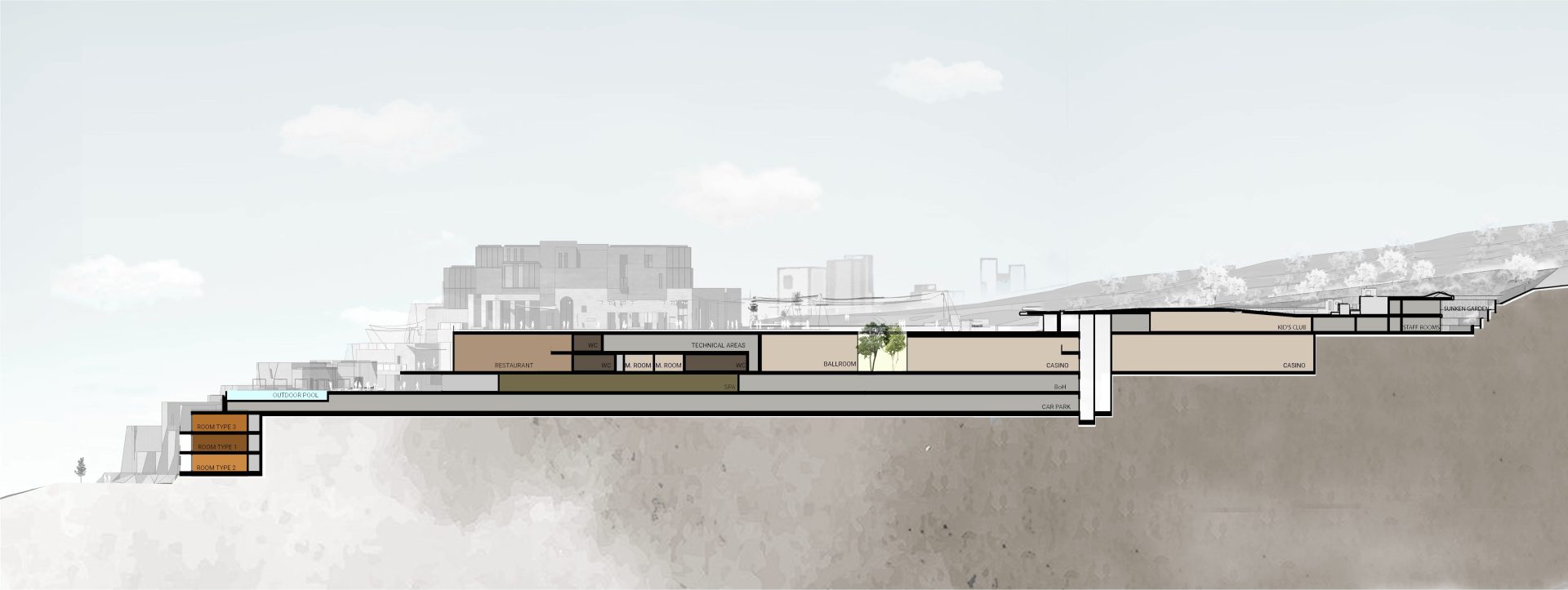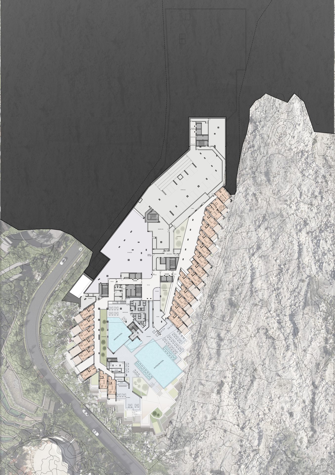 Instead of imposing a monolithic, Hiltonian structure that disrupts the landscape with large-scale intervention, the project seeks to maintain the overall perception of the existing topography and preserve the natural texture of the delta by using a fragmented volumetric strategy through a kind of sophisticated abstraction. The volumetric composition of the building is a result of the dynamic interplay between natural formations and human interventions, seamlessly blurring the boundaries between the two. This inherent dialectic relationship is reflected in the contrasting layers of the composition. The primary layer subtly emerges from the stratum, settling harmoniously into the topography, echoing the rock formations. It gently fractures to sculpt light and shadow and is carved to accommodate a part of the hotel program. This layer essentially serves as a base for the man-made layer, upon which the sharp-edged volumes are placed, recalling Mediterranean settlement compositions.