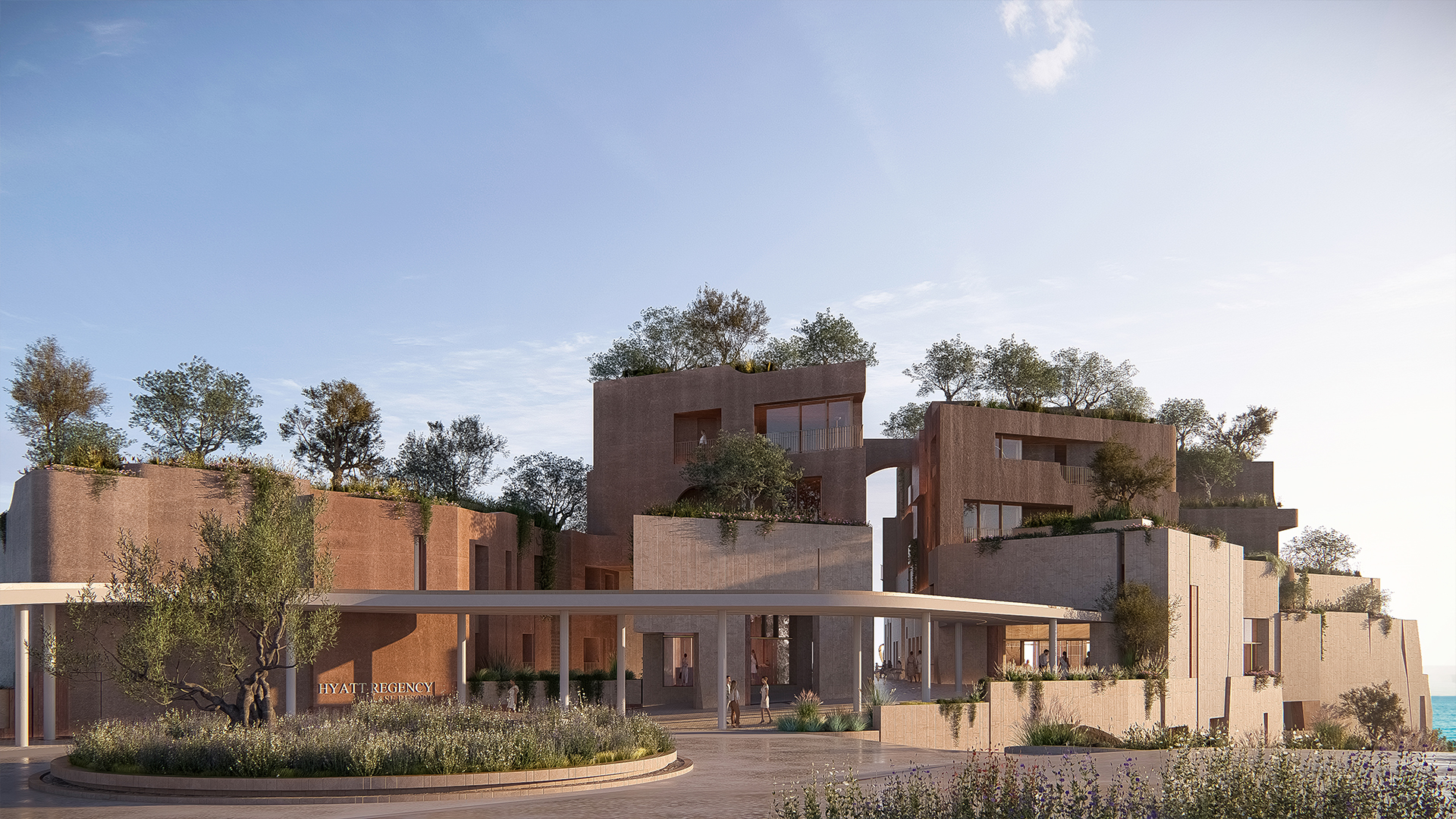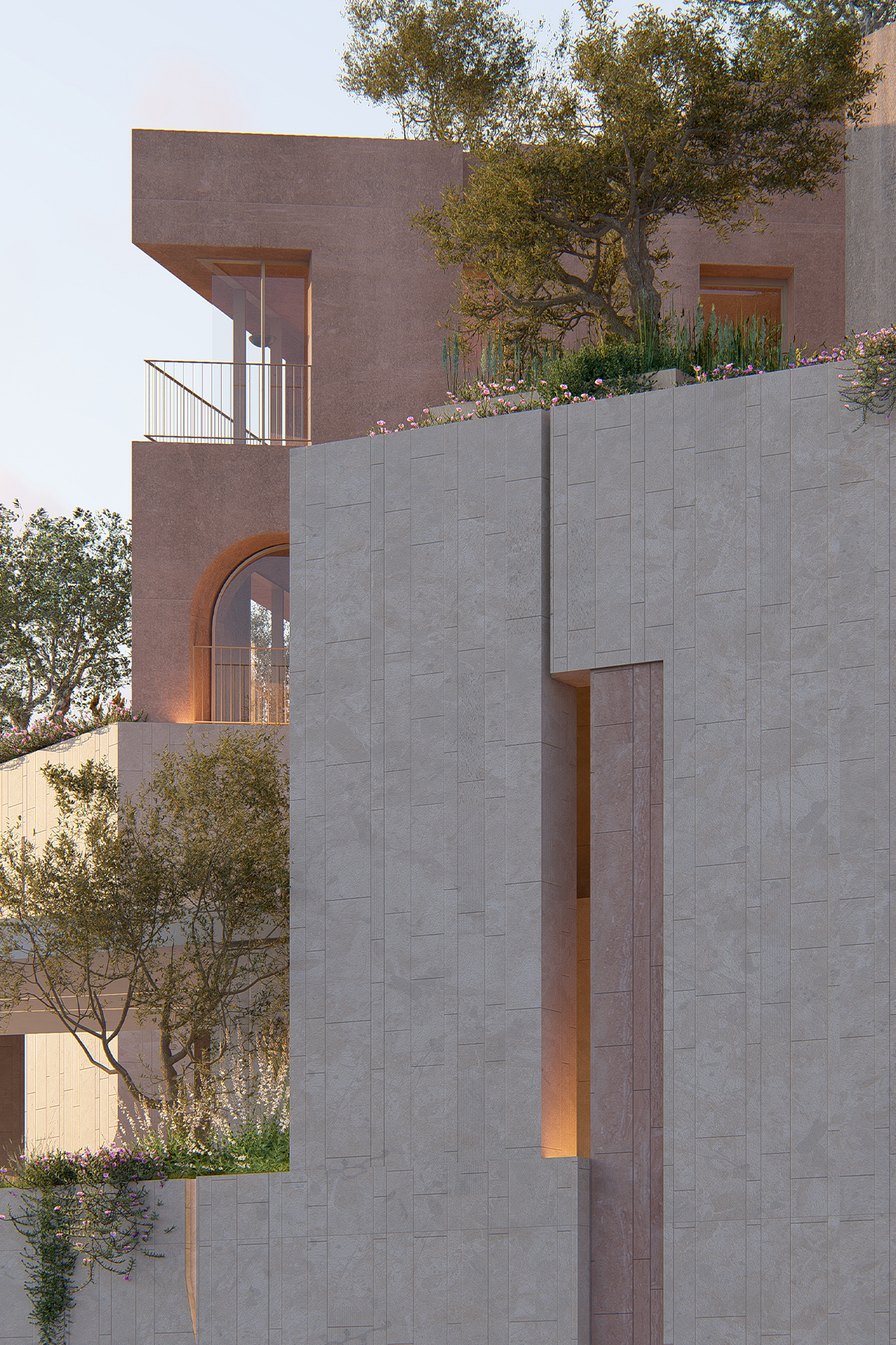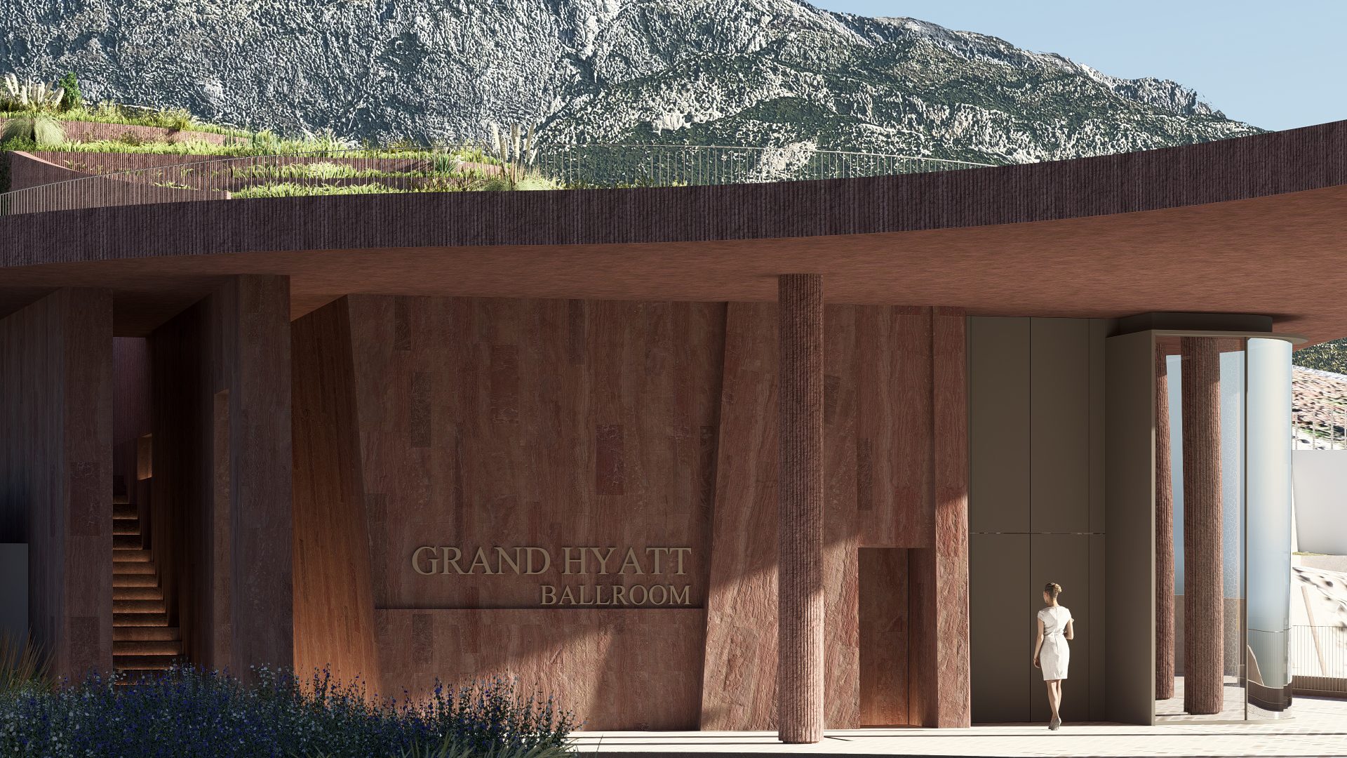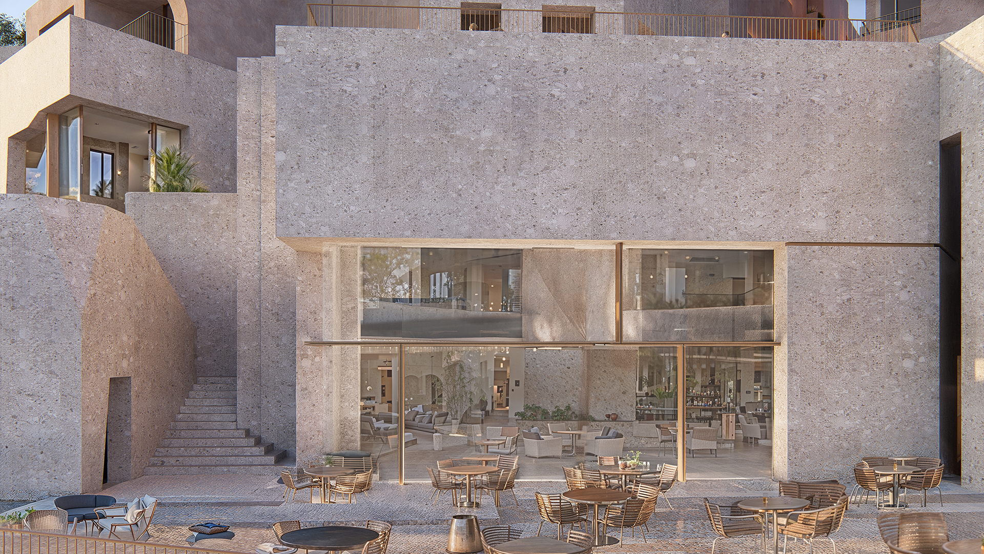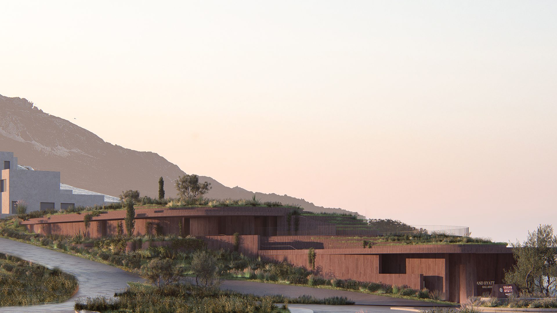 Instead of imposing a monolithic, Hiltonian structure that disrupts the landscape with large-scale intervention, the project seeks to maintain the overall perception of the existing topography and preserve the natural texture of the delta by using a fragmented volumetric strategy through a kind of sophisticated abstraction. The volumetric composition of the building is a result of the dynamic interplay between natural formations and human interventions, seamlessly blurring the boundaries between the two. This inherent dialectic relationship is reflected in the contrasting layers of the composition. The primary layer subtly emerges from the stratum, settling harmoniously into the topography, echoing the rock formations. It gently fractures to sculpt light and shadow and is carved to accommodate a part of the hotel program. This layer essentially serves as a base for the man-made layer, upon which the sharp-edged volumes are placed, recalling Mediterranean settlement compositions.