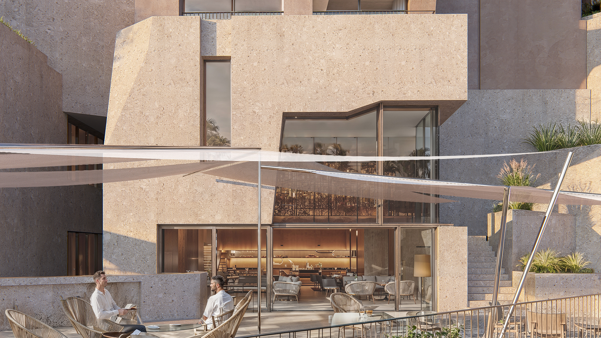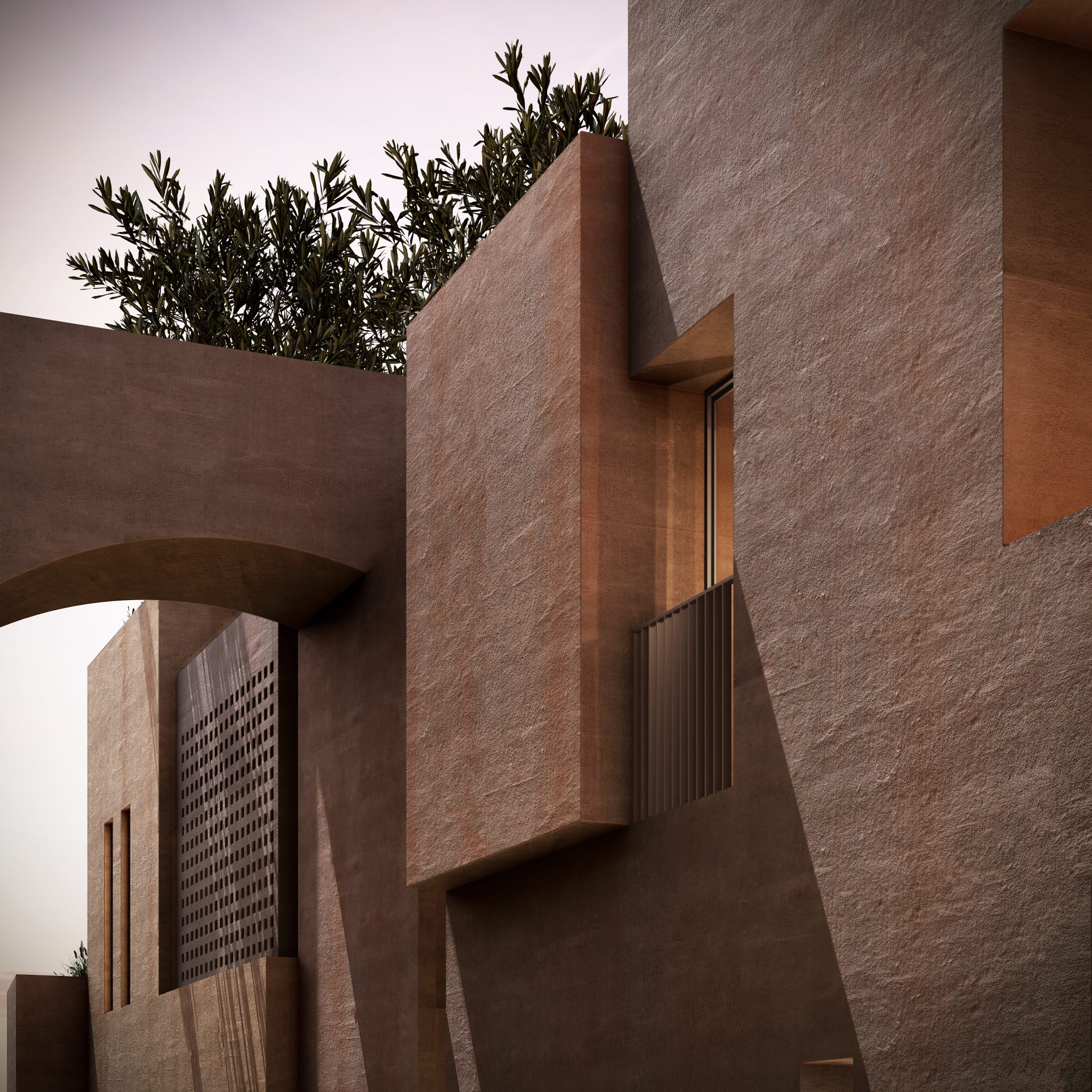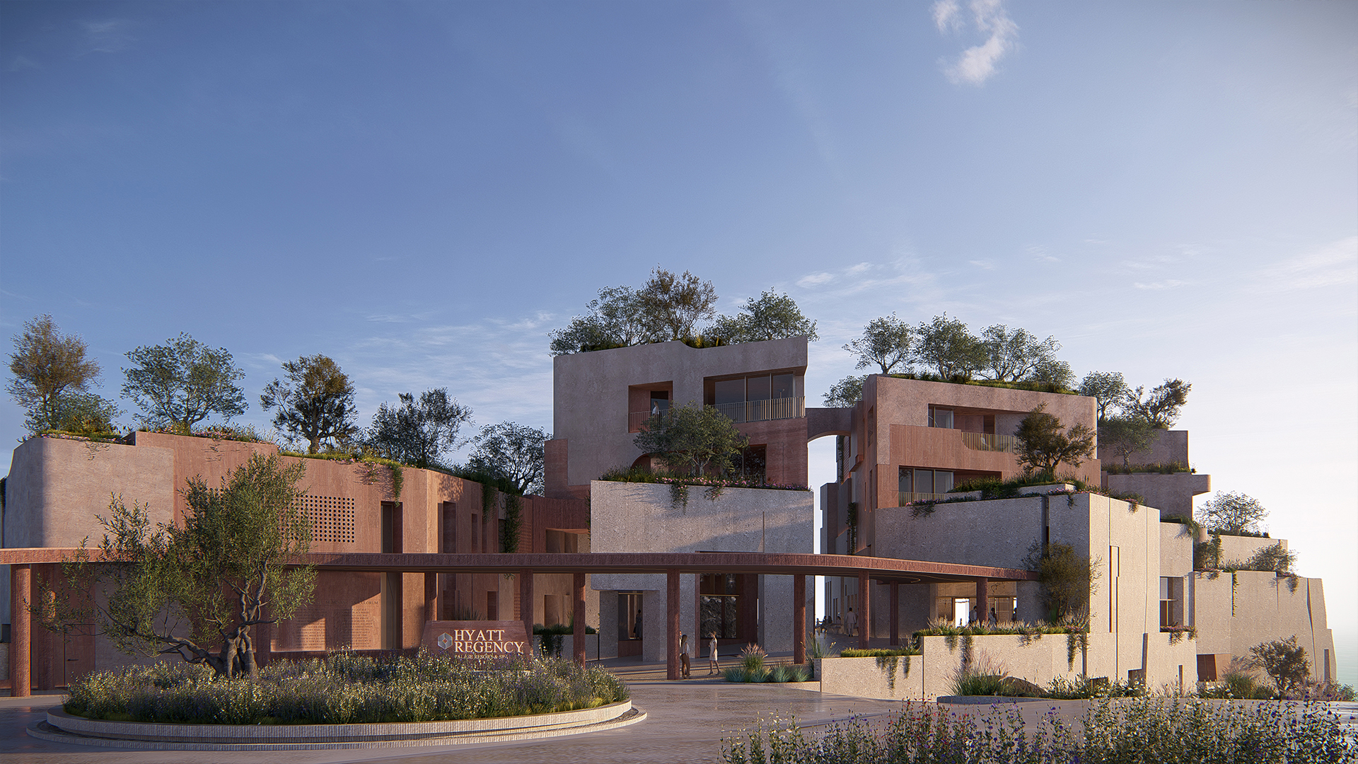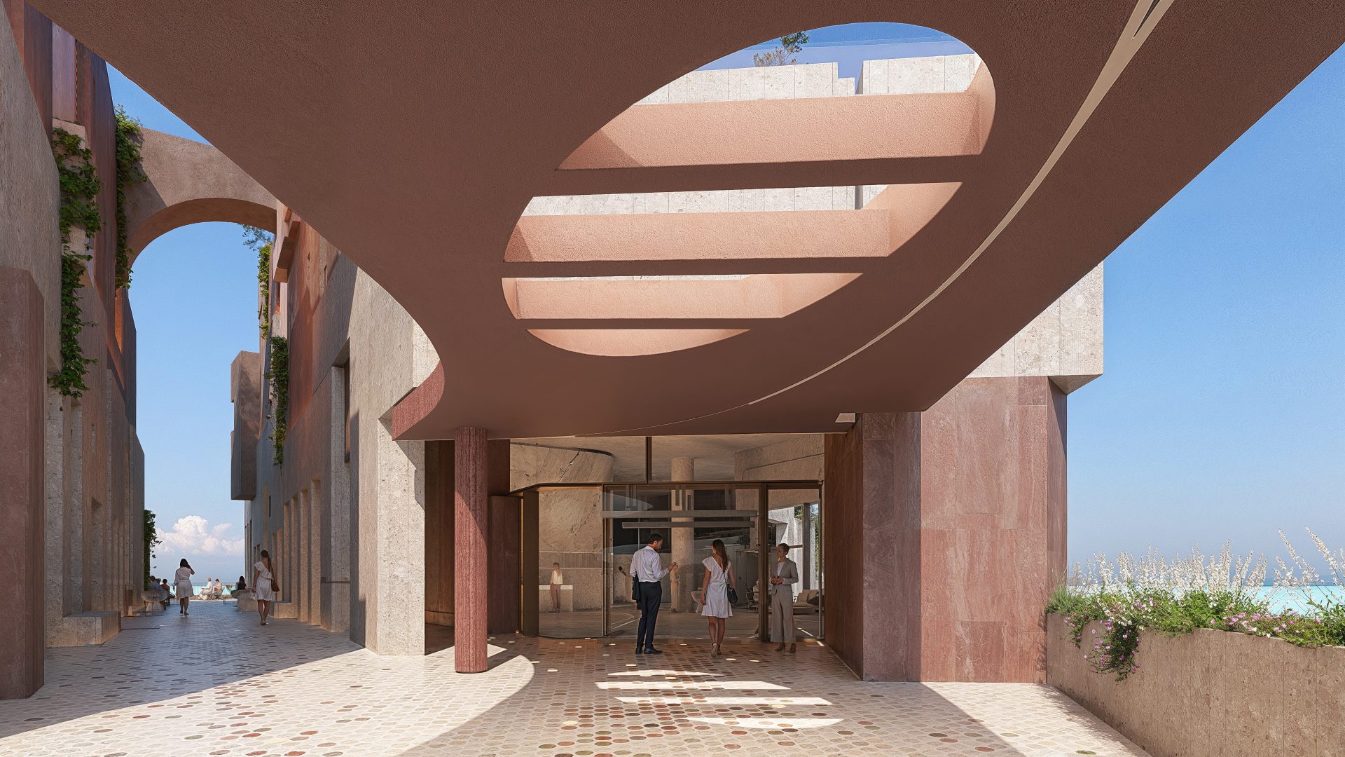 Instead of imposing a monolithic, Hiltonian structure that disrupts the landscape with large-scale intervention, the project seeks to maintain the overall perception of the existing topography and preserve the natural texture of the delta by using a fragmented volumetric strategy through a kind of sophisticated abstraction. The volumetric composition of the building is a result of the dynamic interplay between natural formations and human interventions, seamlessly blurring the boundaries between the two. This inherent dialectic relationship is reflected in the contrasting layers of the composition. The primary layer subtly emerges from the stratum, settling harmoniously into the topography, echoing the rock formations. It gently fractures to sculpt light and shadow and is carved to accommodate a part of the hotel program. This layer essentially serves as a base for the man-made layer, upon which the sharp-edged volumes are placed, recalling Mediterranean settlement compositions.