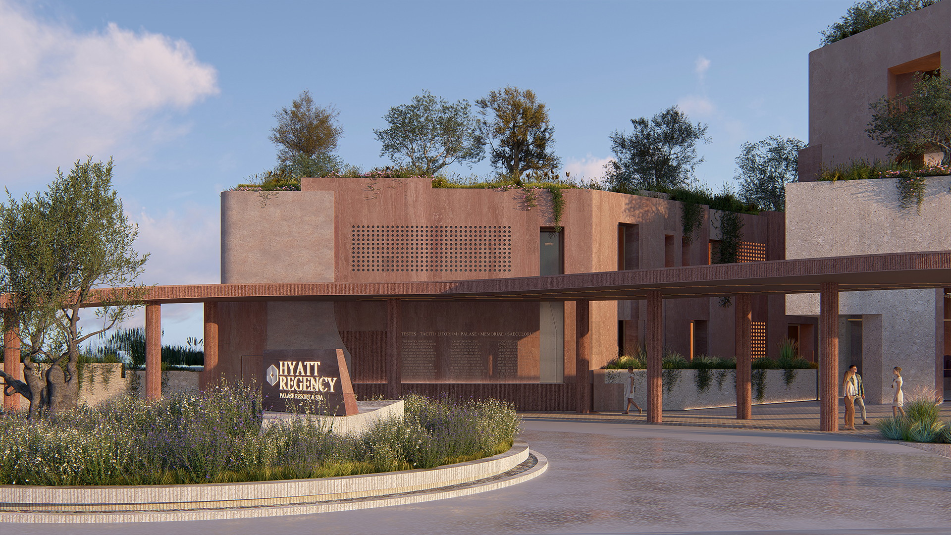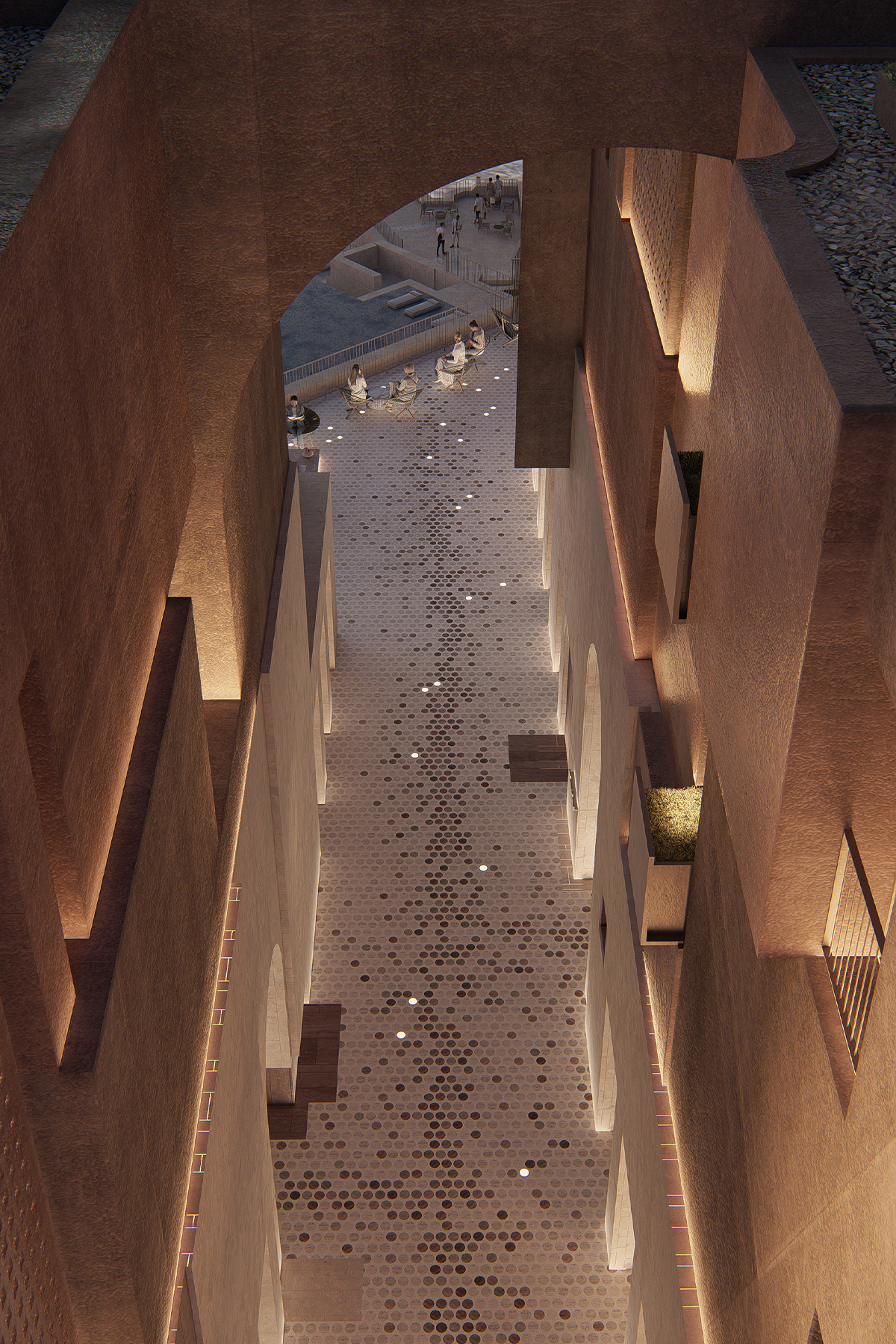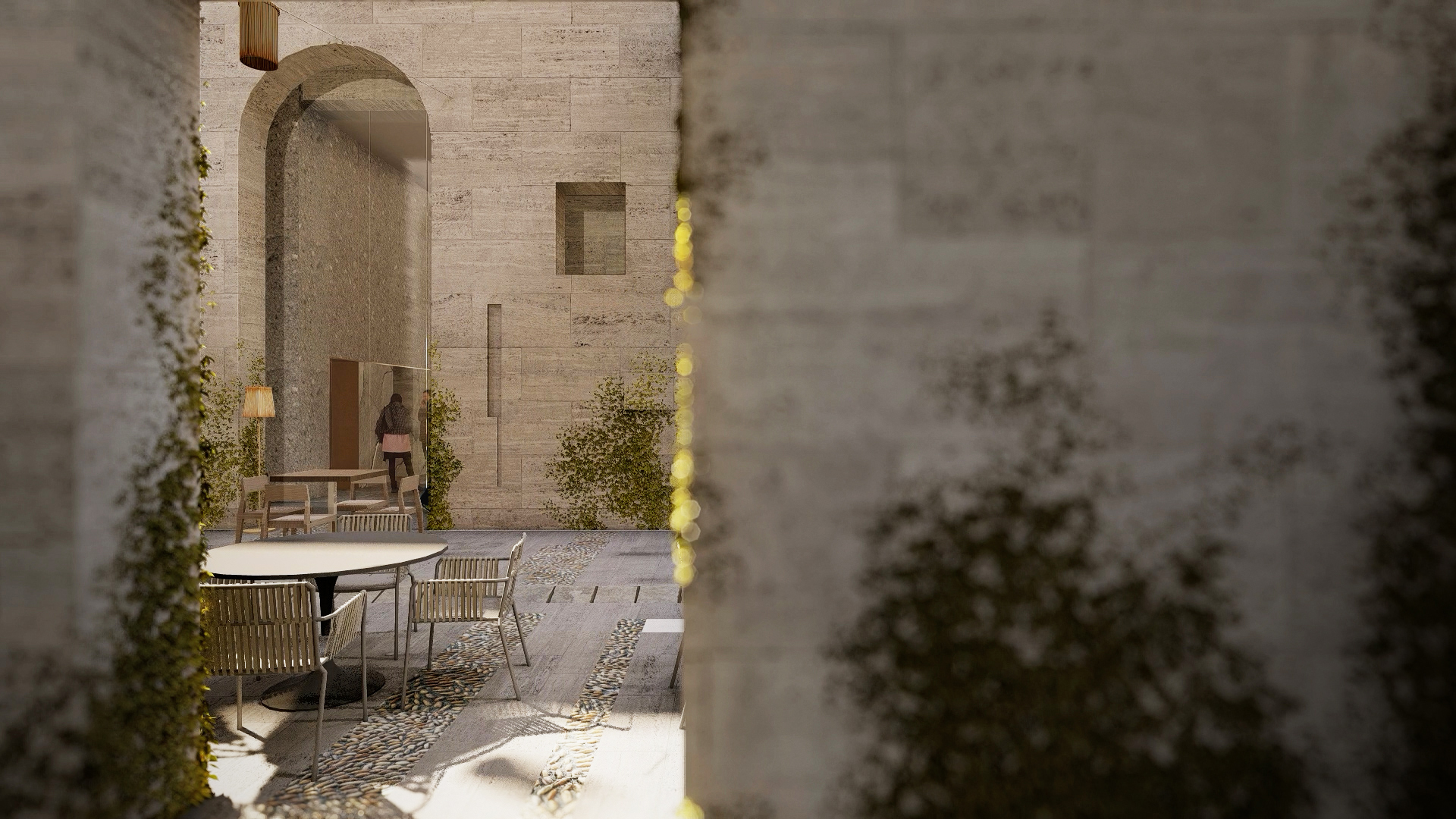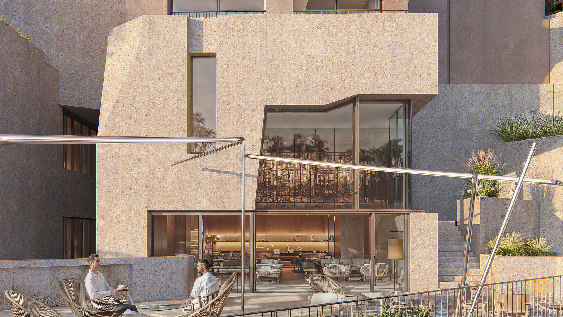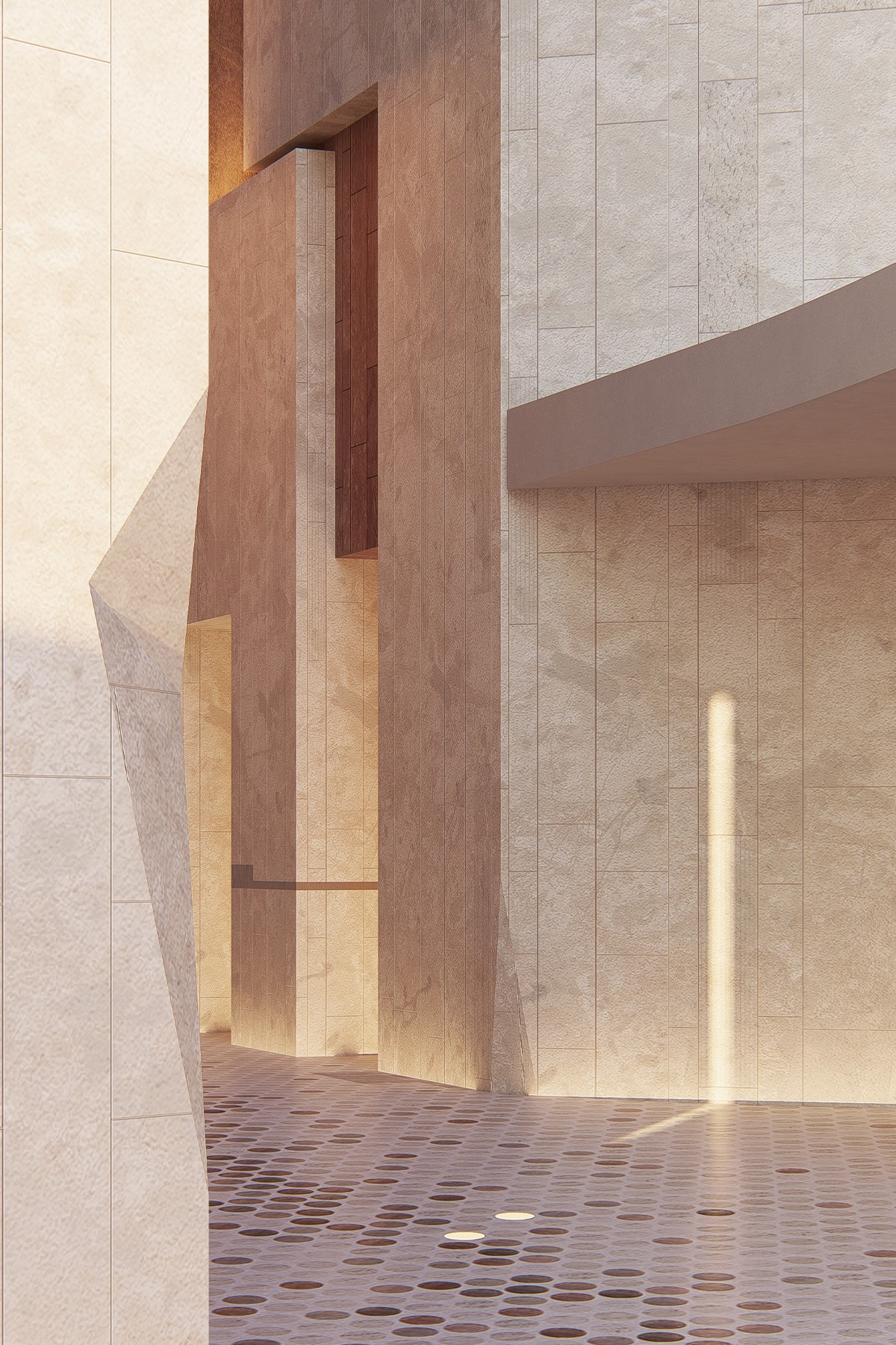 Instead of imposing a monolithic, Hiltonian structure that disrupts the landscape with large-scale intervention, the project seeks to maintain the overall perception of the existing topography and preserve the natural texture of the delta by using a fragmented volumetric strategy through a kind of sophisticated abstraction. The volumetric composition of the building is a result of the dynamic interplay between natural formations and human interventions, seamlessly blurring the boundaries between the two. This inherent dialectic relationship is reflected in the contrasting layers of the composition. The primary layer subtly emerges from the stratum, settling harmoniously into the topography, echoing the rock formations. It gently fractures to sculpt light and shadow and is carved to accommodate a part of the hotel program. This layer essentially serves as a base for the man-made layer, upon which the sharp-edged volumes are placed, recalling Mediterranean settlement compositions.