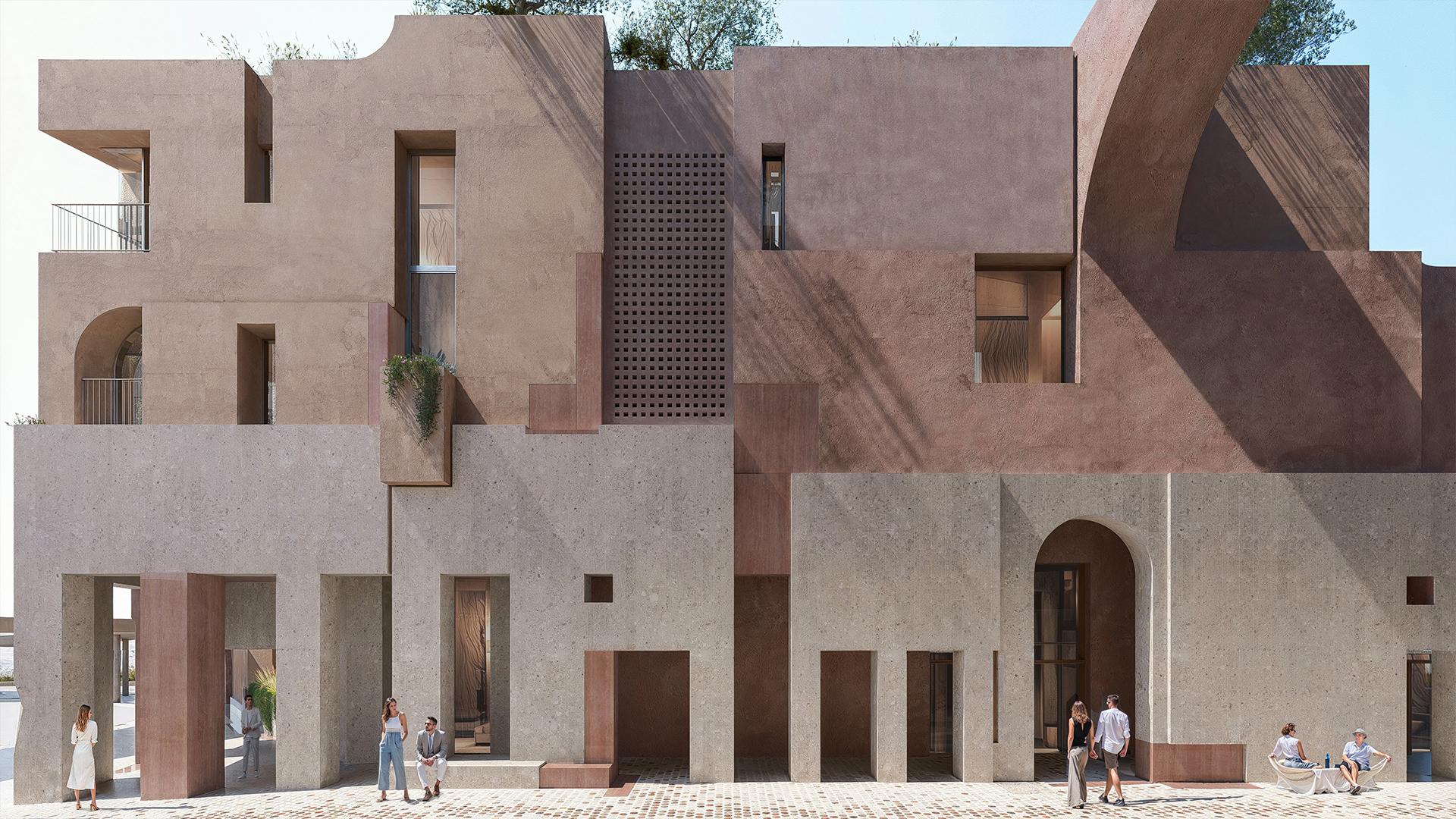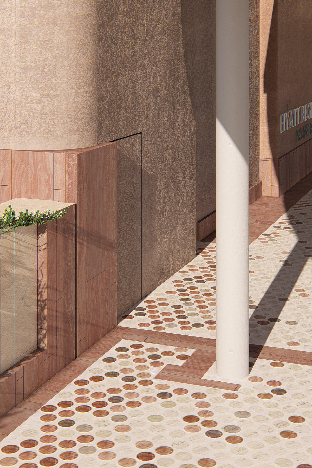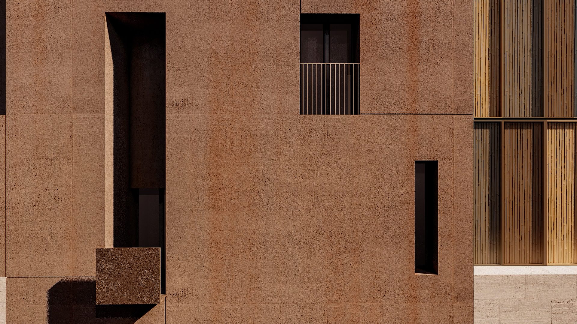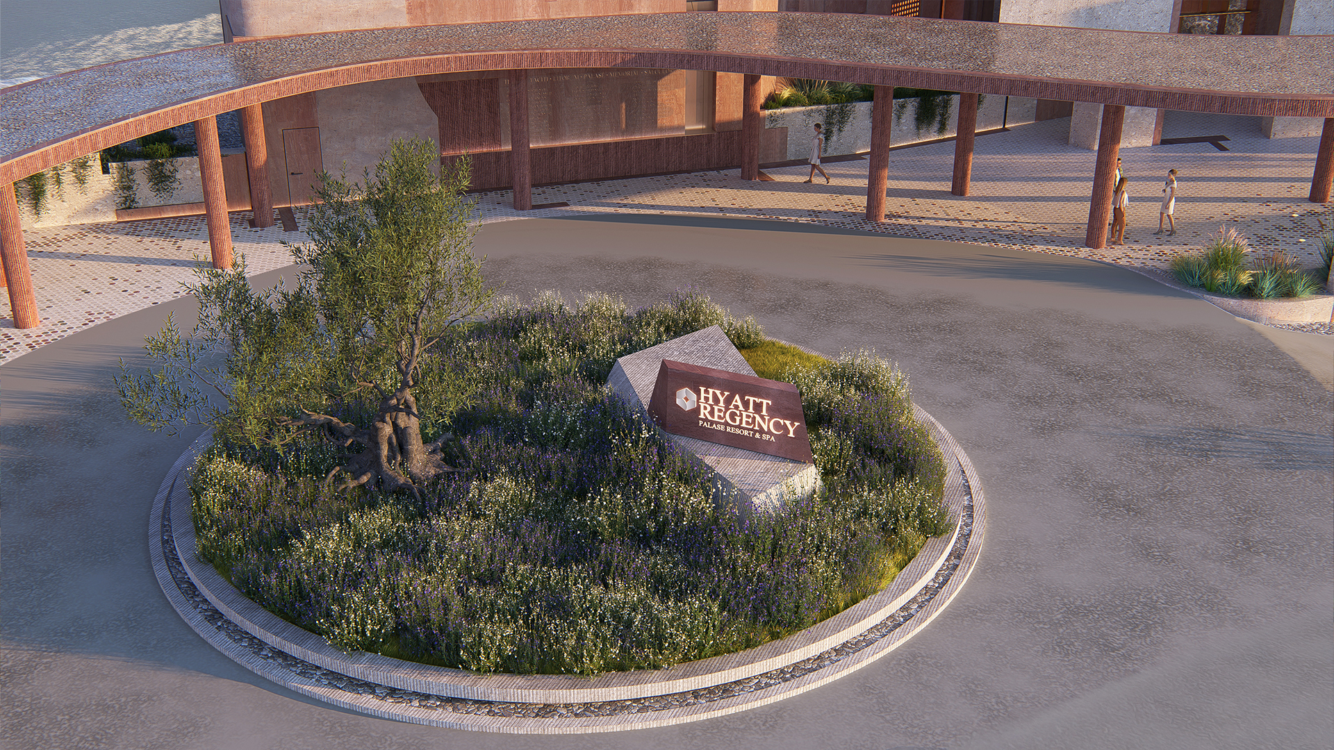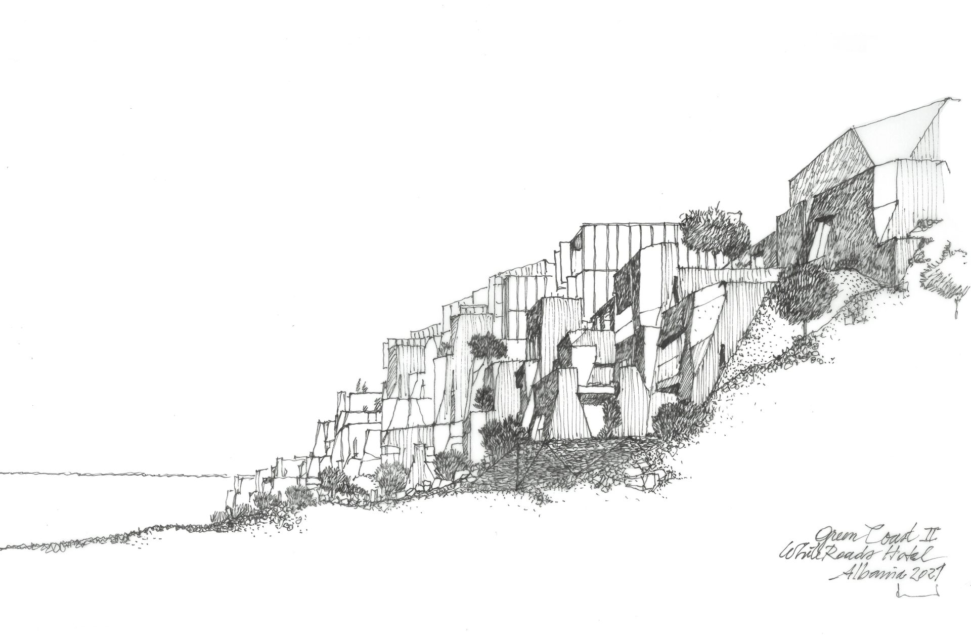 Instead of imposing a monolithic, Hiltonian structure that disrupts the landscape with large-scale intervention, the project seeks to maintain the overall perception of the existing topography and preserve the natural texture of the delta by using a fragmented volumetric strategy through a kind of sophisticated abstraction. The volumetric composition of the building is a result of the dynamic interplay between natural formations and human interventions, seamlessly blurring the boundaries between the two. This inherent dialectic relationship is reflected in the contrasting layers of the composition. The primary layer subtly emerges from the stratum, settling harmoniously into the topography, echoing the rock formations. It gently fractures to sculpt light and shadow and is carved to accommodate a part of the hotel program. This layer essentially serves as a base for the man-made layer, upon which the sharp-edged volumes are placed, recalling Mediterranean settlement compositions.