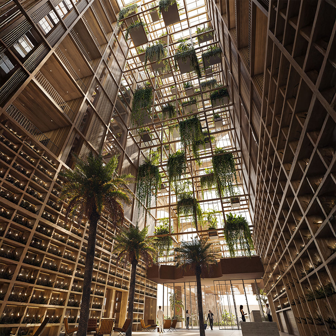 The interior design continues the theme of a green, landscaped aesthetic, with natural materials, such as wood, dominating the communal spaces. Vegetation in the atrium further enhance the environment, serving as the primary decorative feature while creating a harmonious balance between natural and contemporary design elements.