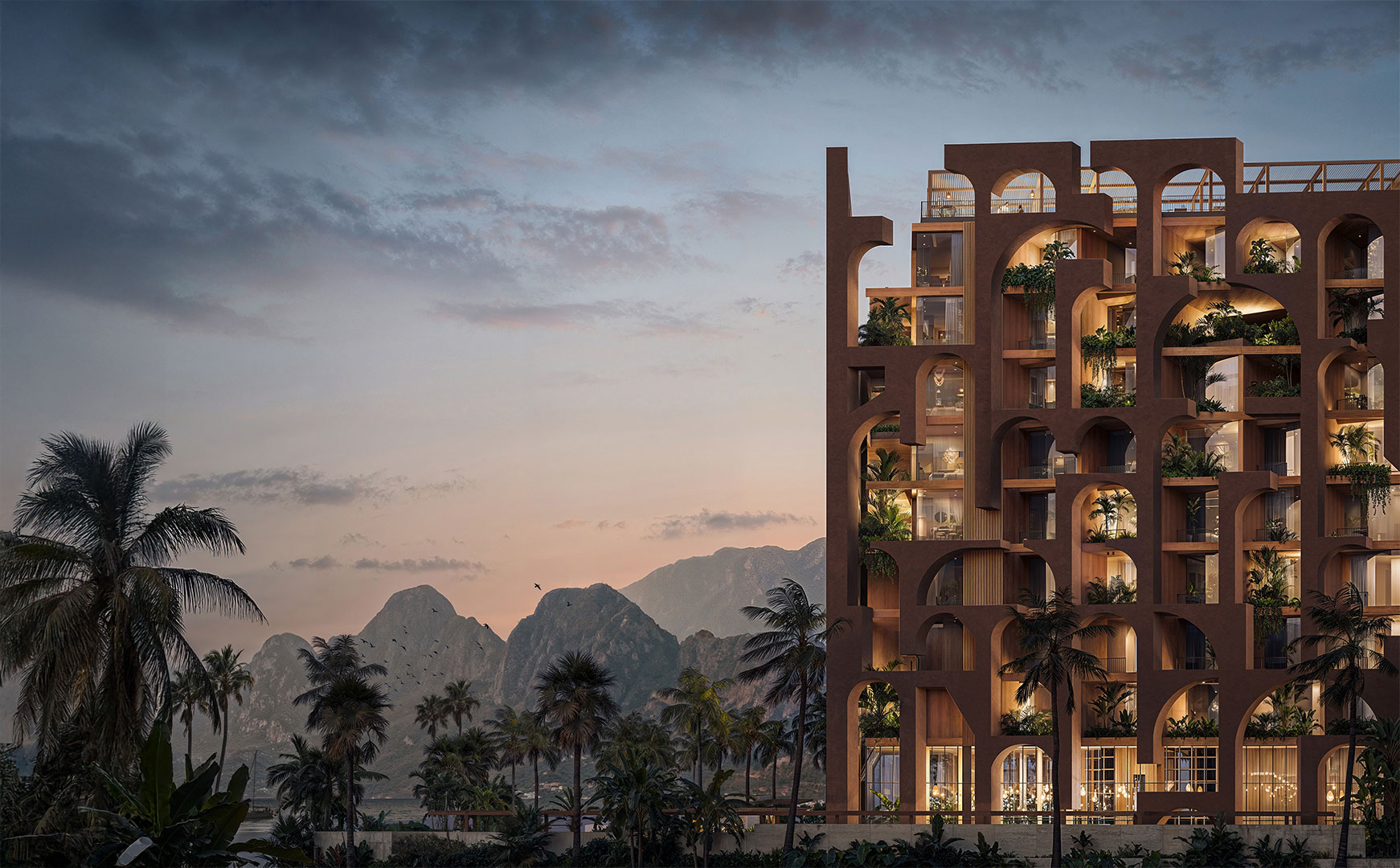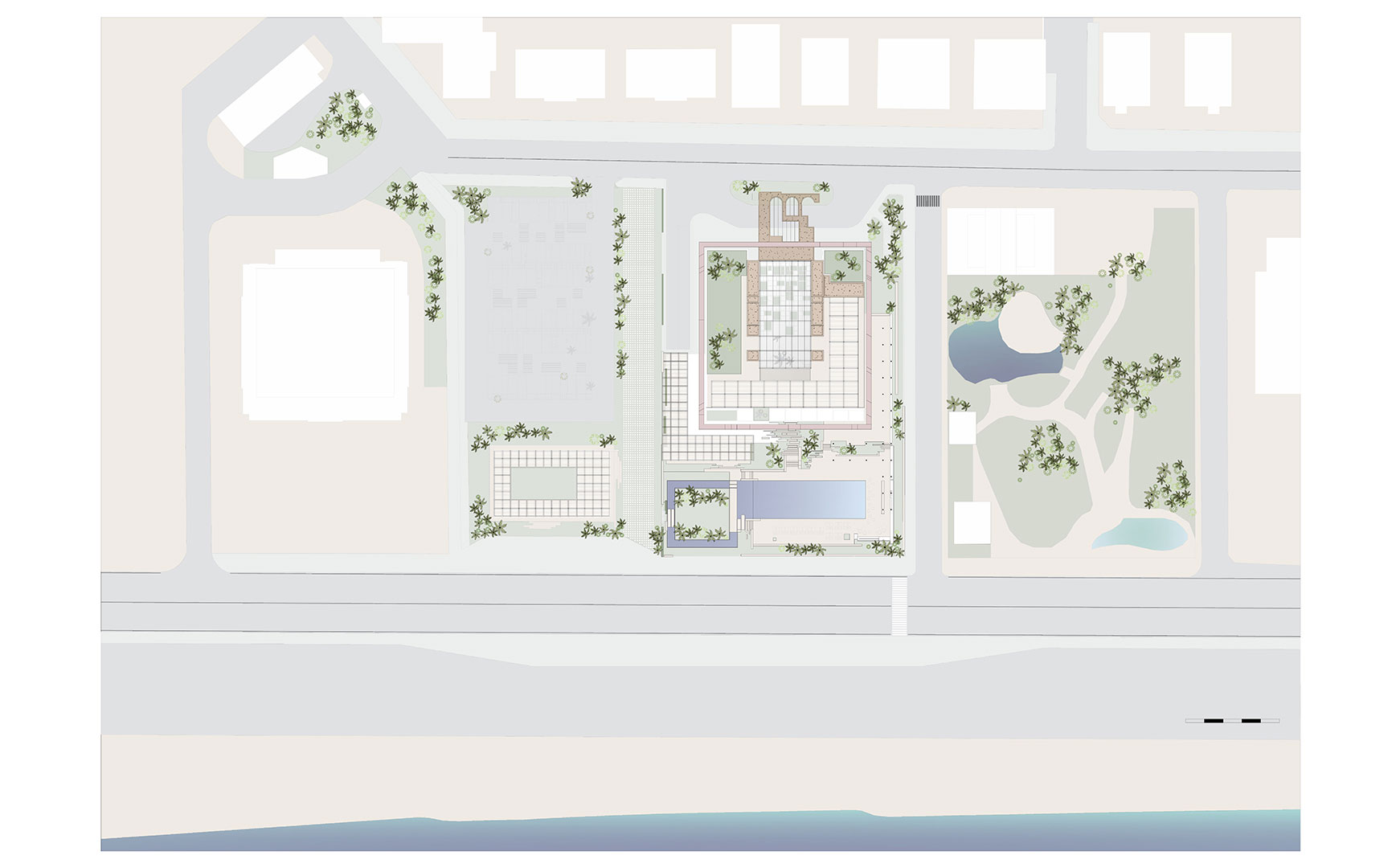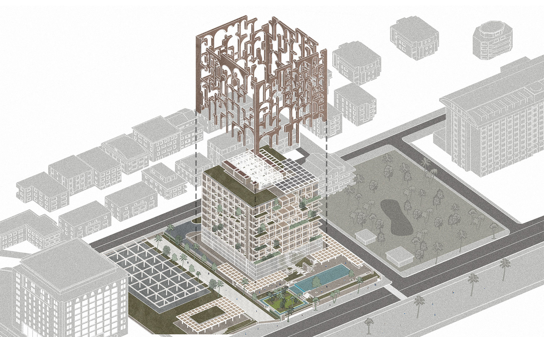 The architectural composition of the building’s shell integrates both regional context and formal design principles, resulting in a cohesive structure that evokes a theatrical quality. This effect is achieved through rational planning, which ensures that all rooms face the sea. Unlike conventional city hotels, the design envisions a vertical resort rather than a horizontal plan. Each floor introduces a new “ground,” characterized by landscaped terraces and a central atrium that visually links the building’s levels. This approach defines the project as a “vertical resort.”
