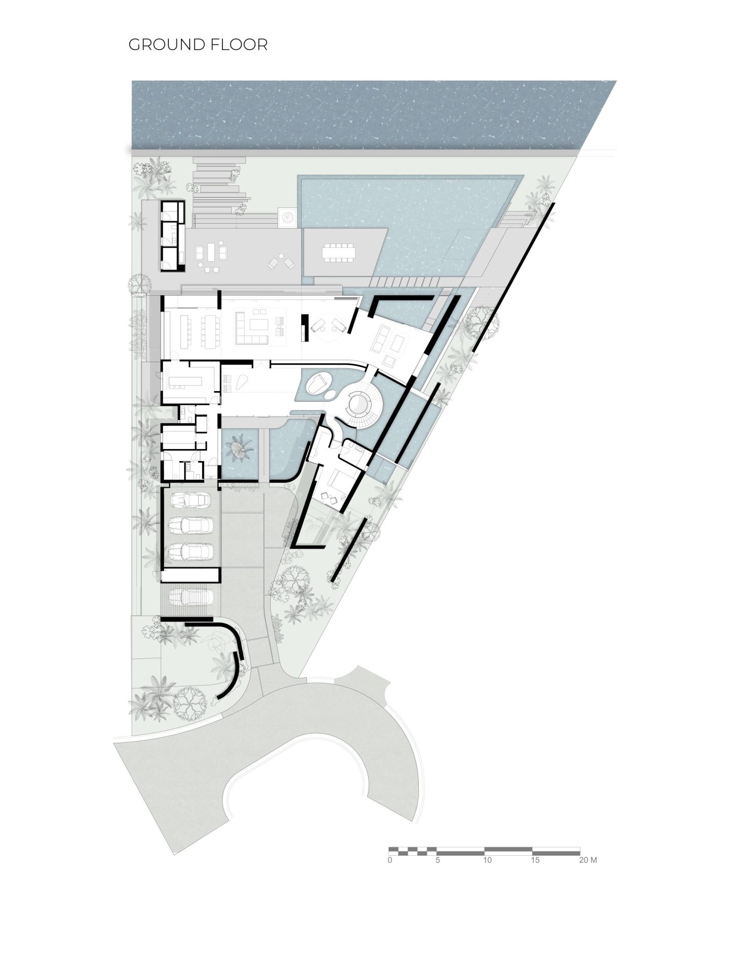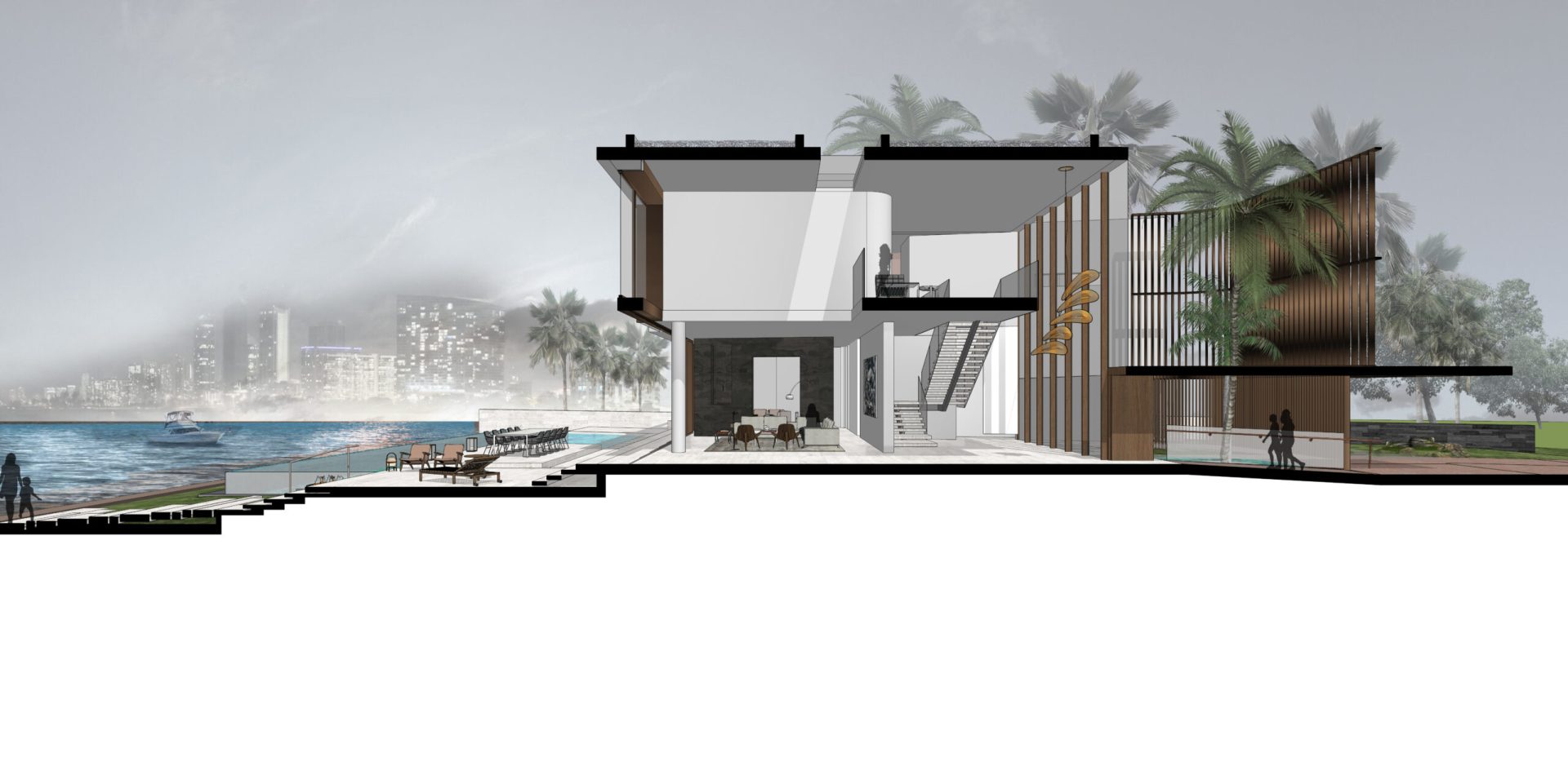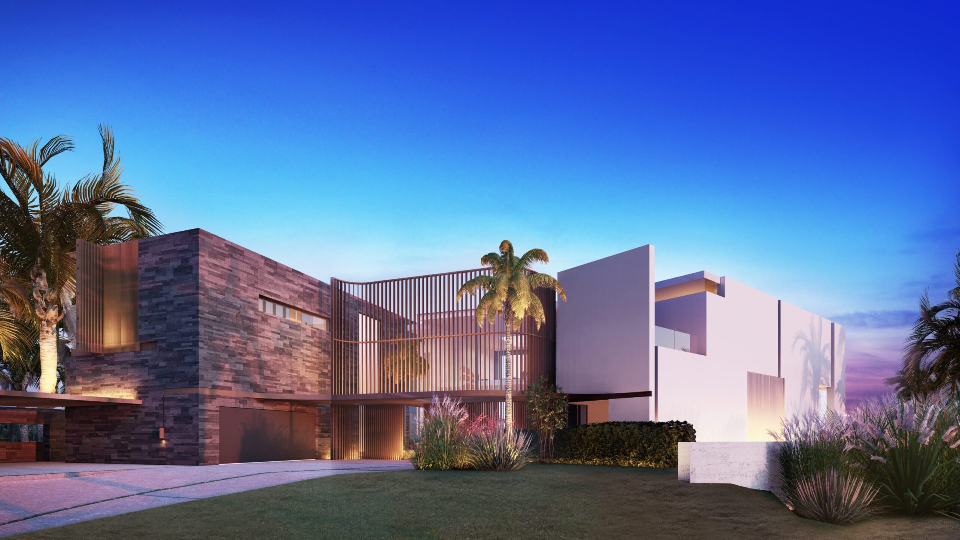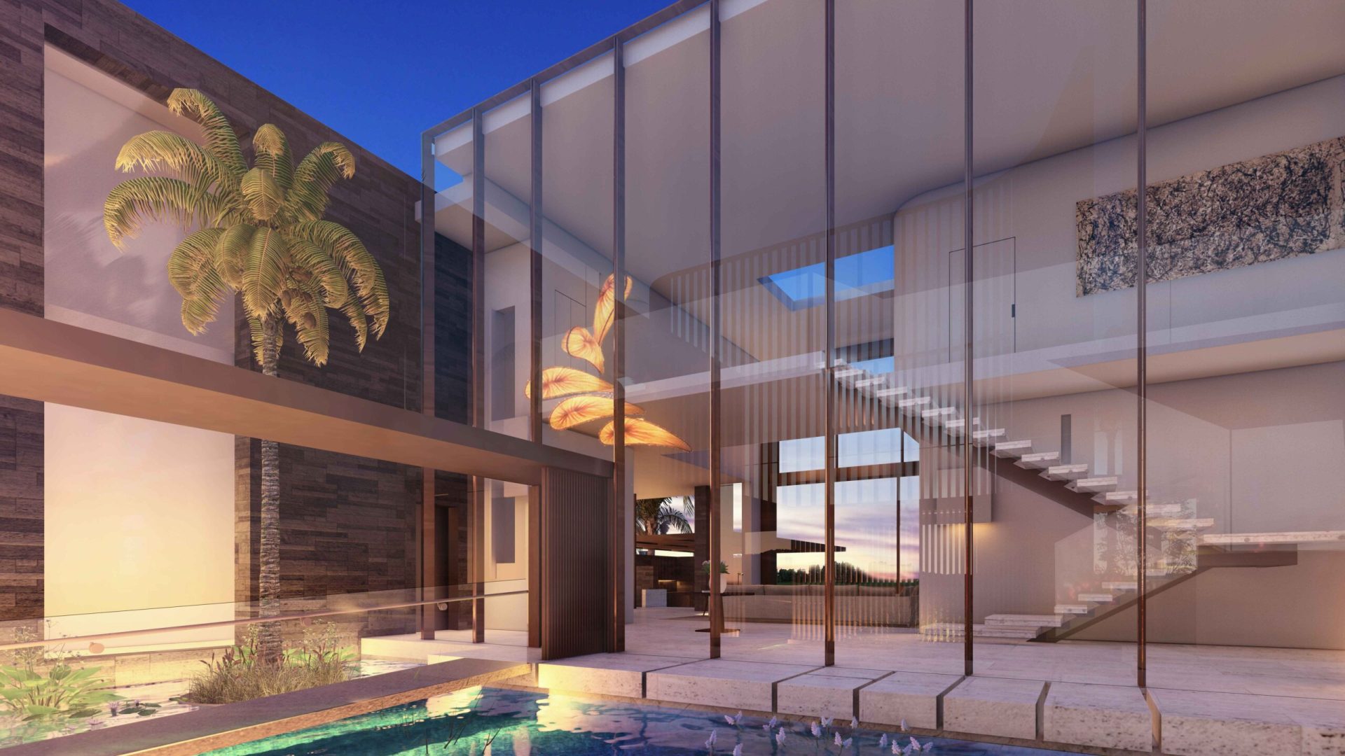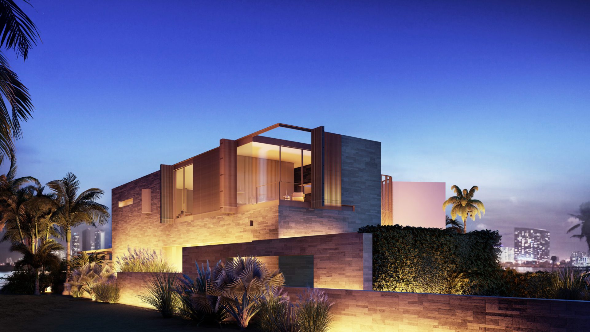 Located on Sabal Palm Road in the exclusive Bay Point Estates area, this house offers views of Biscayne Bay and downtown Miami. Gray-brown stone walls are contrasted with white surfaces that recall the architecture of the city. Upper-level timber shutters protect the west facade from the sun, while skylights bring ample natural light inside. Residents and visitors enter the foyer of the house by passing through a narrow opening in a rammed earth wall, then encounter an unexpected courtyard that features a reflecting pond in an oasis-like landscape and serves as the central core of the home. Inside, beginning with the foyer, there is a view of Biscayne Bay, but the view is partially obstructed further on, increasing the sense of dynamic space. The swimming pool features a lap area, a spa, and a lounging space with an infinity edge. The upper floor, where most of the rooms are located, offers views of the Biscayne Bay that celebrate a sense of tranquility.