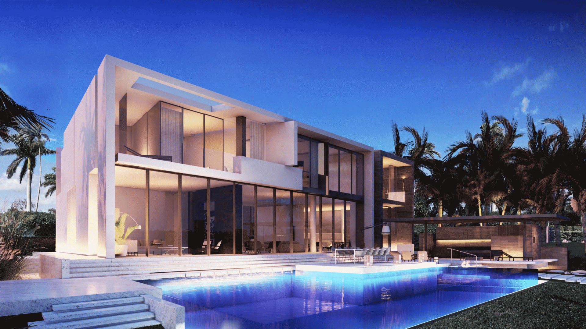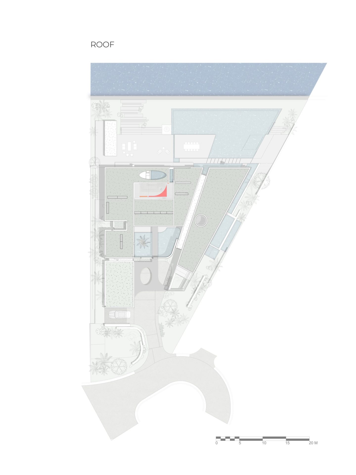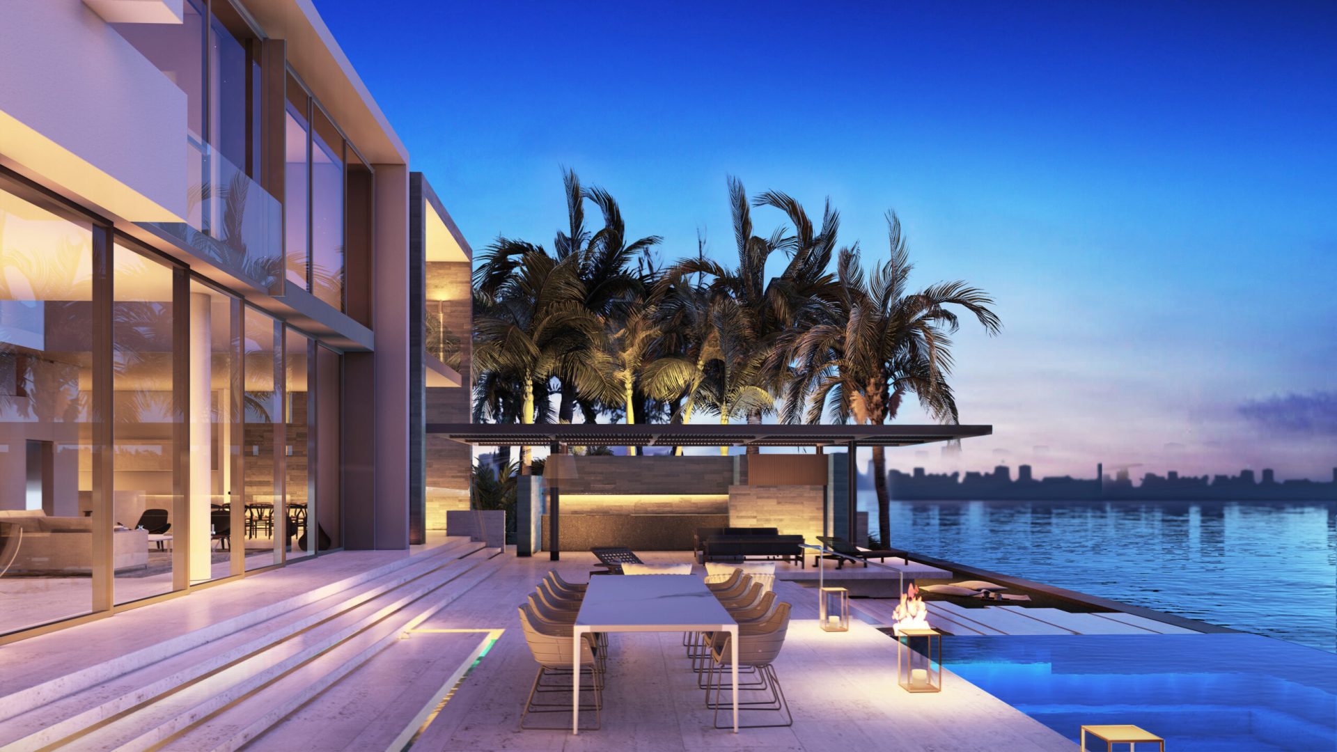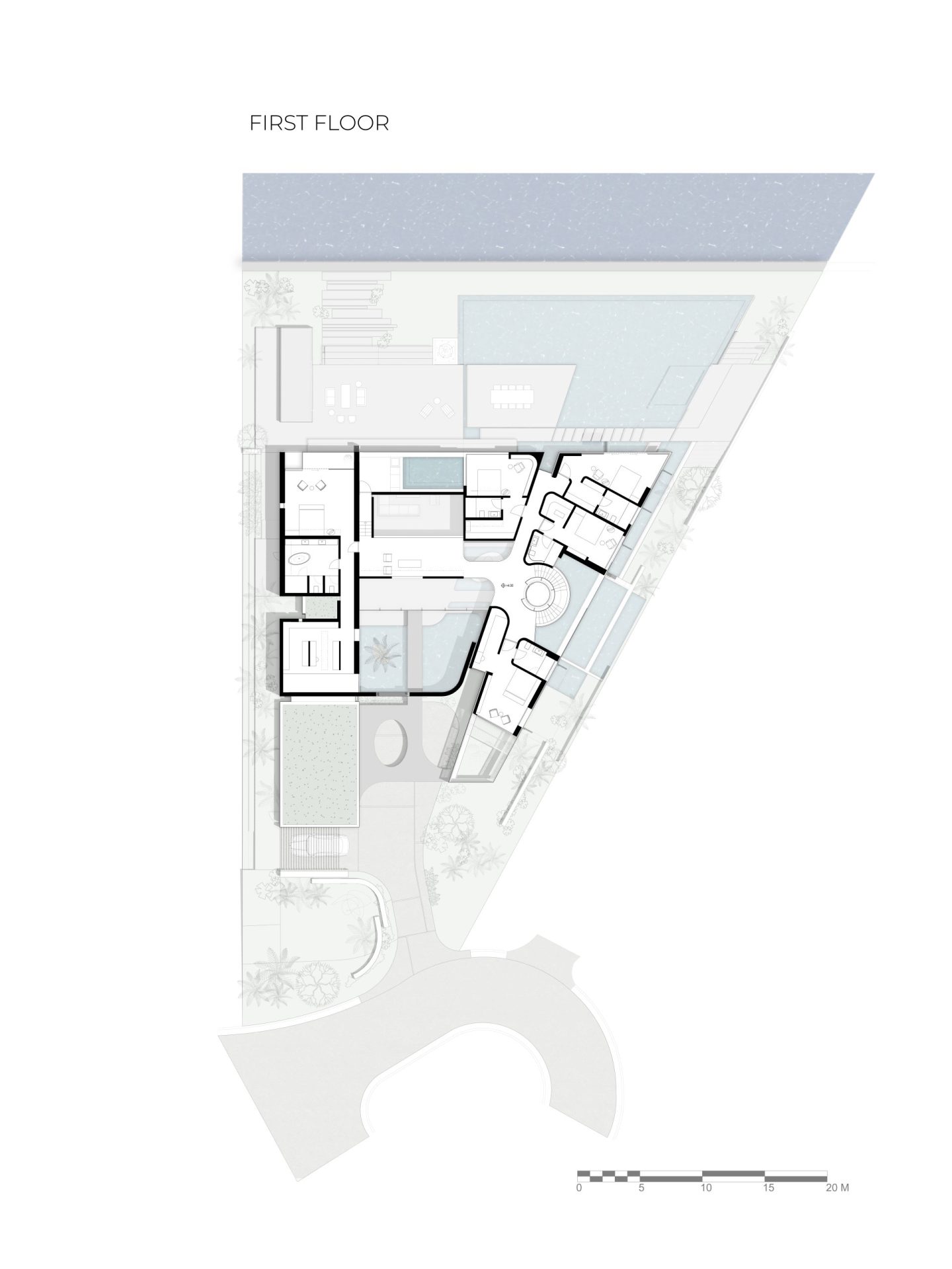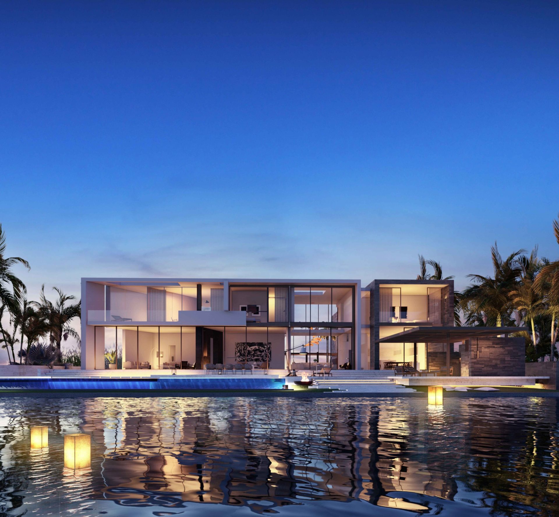 Located on Sabal Palm Road in the exclusive Bay Point Estates area, this house offers views of Biscayne Bay and downtown Miami. Gray-brown stone walls are contrasted with white surfaces that recall the architecture of the city. Upper-level timber shutters protect the west facade from the sun, while skylights bring ample natural light inside. Residents and visitors enter the foyer of the house by passing through a narrow opening in a rammed earth wall, then encounter an unexpected courtyard that features a reflecting pond in an oasis-like landscape and serves as the central core of the home. Inside, beginning with the foyer, there is a view of Biscayne Bay, but the view is partially obstructed further on, increasing the sense of dynamic space. The swimming pool features a lap area, a spa, and a lounging space with an infinity edge. The upper floor, where most of the rooms are located, offers views of the Biscayne Bay that celebrate a sense of tranquility.