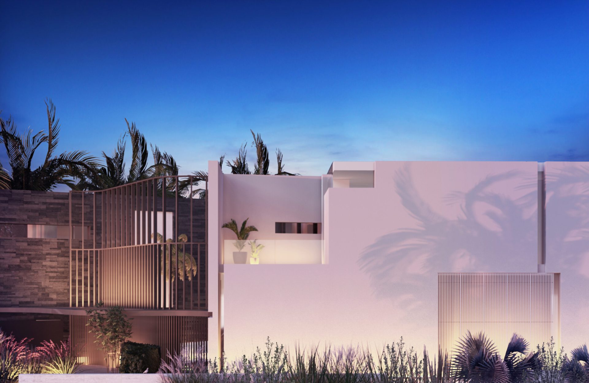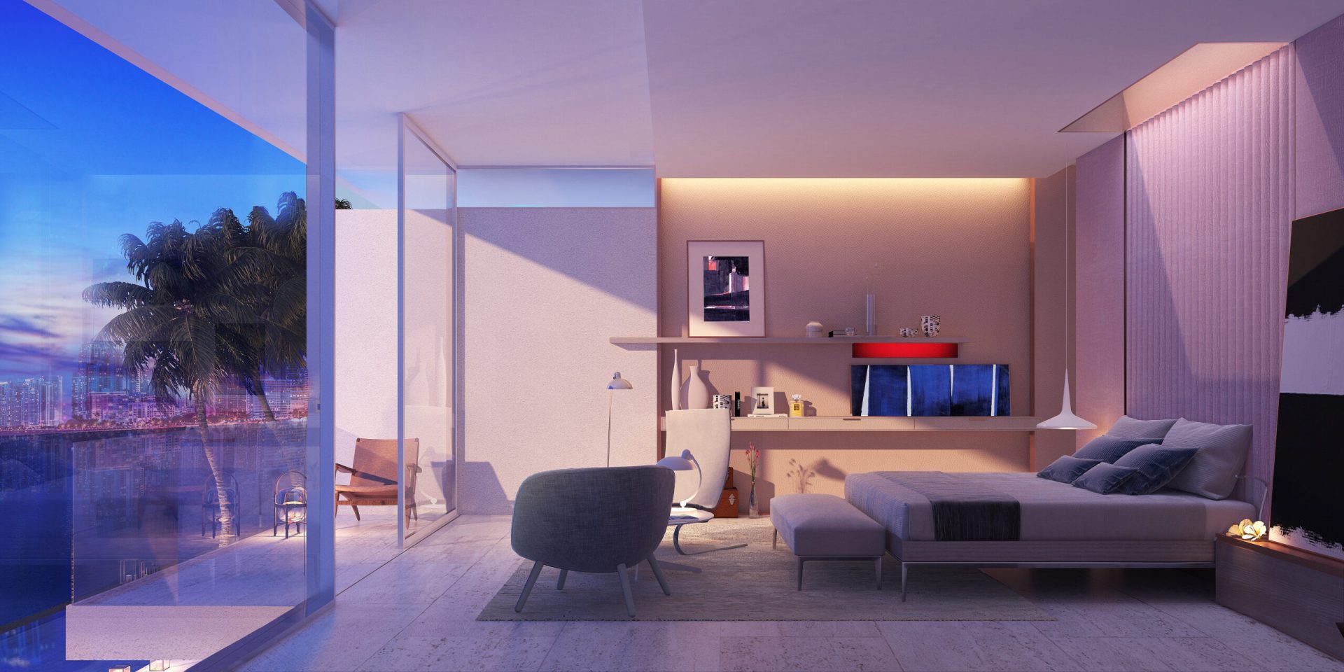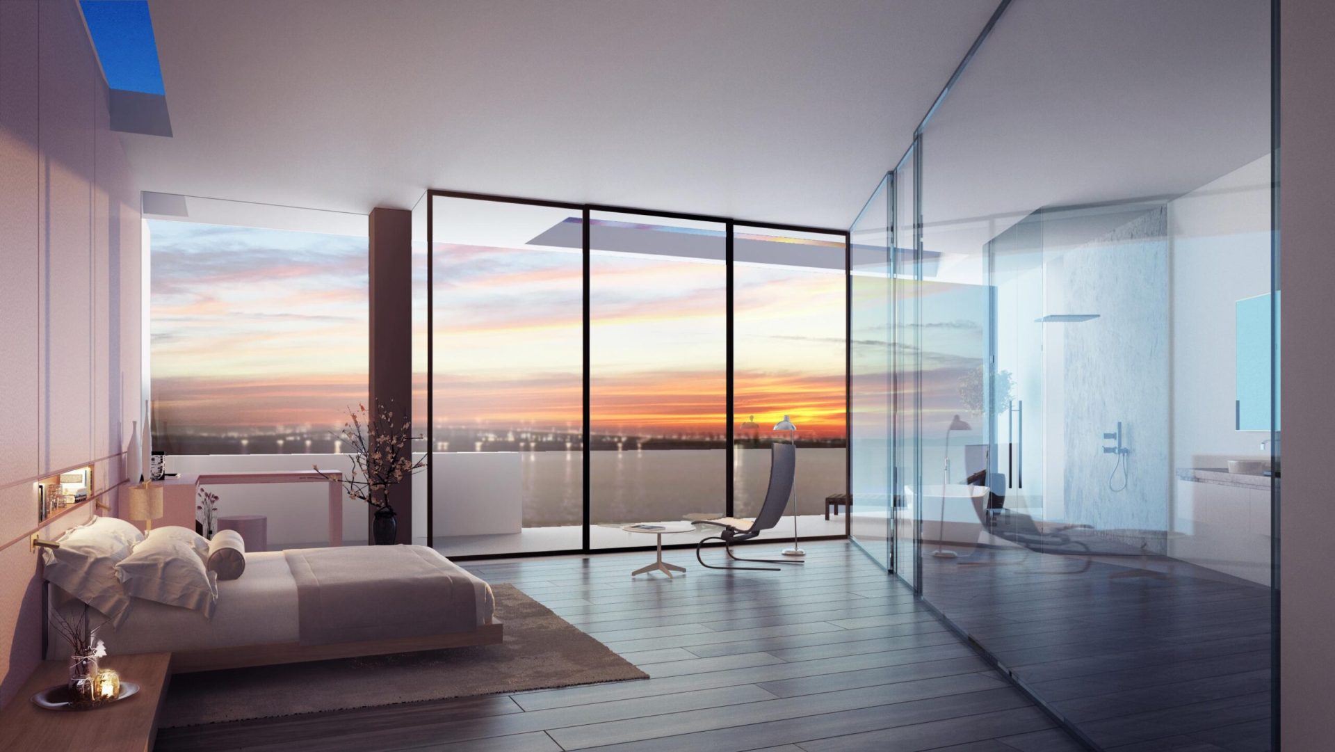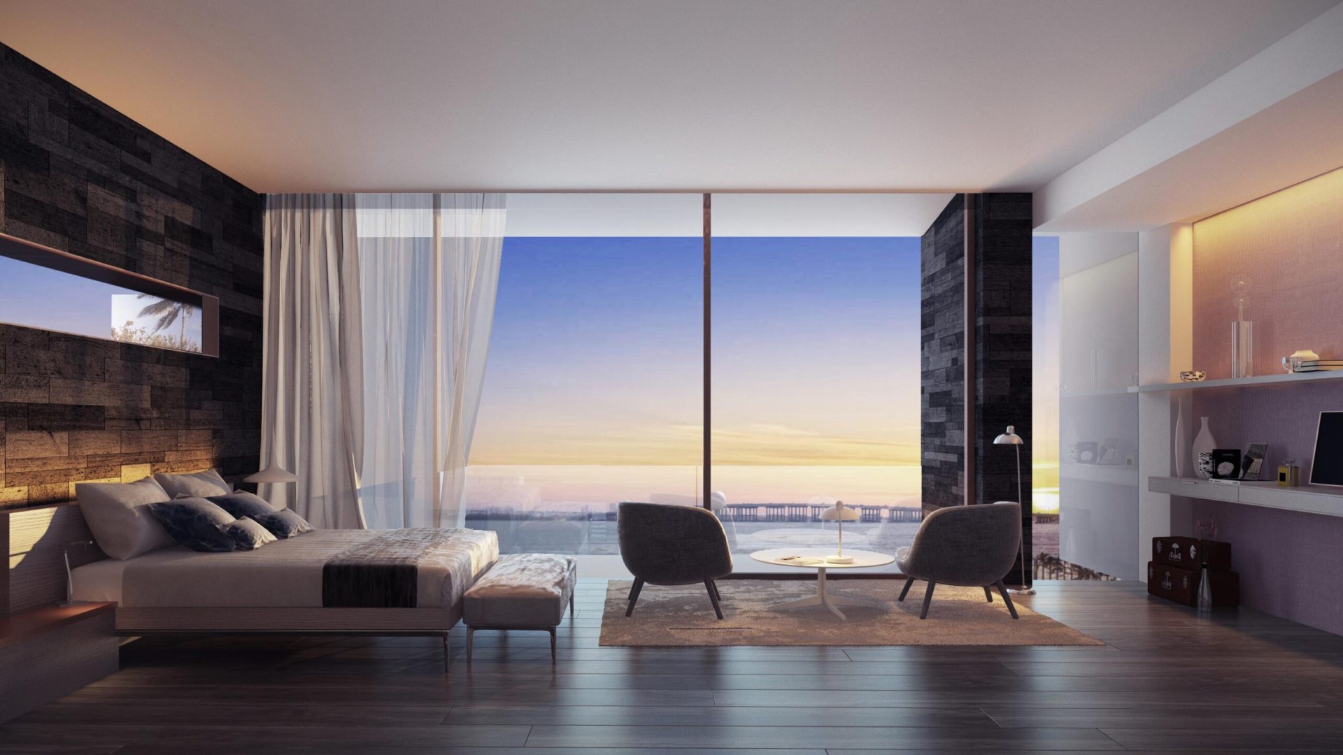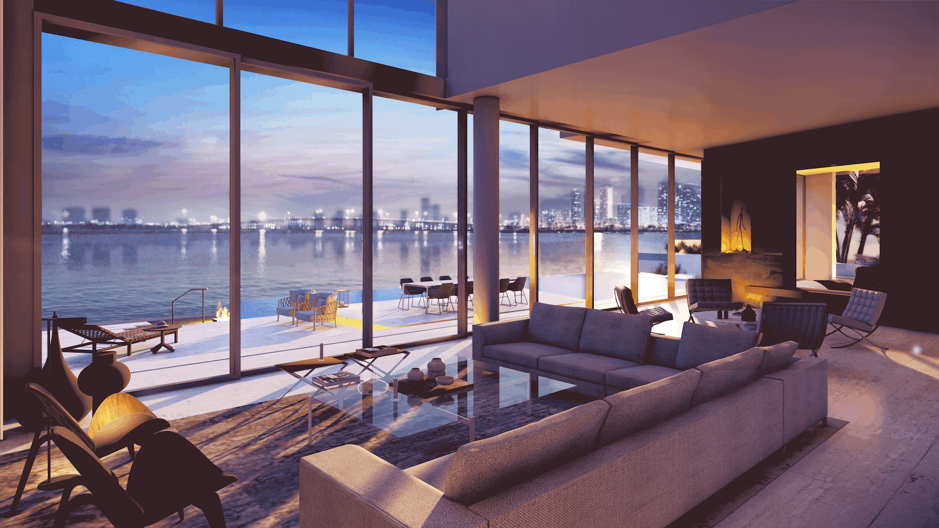 Located on Sabal Palm Road in the exclusive Bay Point Estates area, this house offers views of Biscayne Bay and downtown Miami. Gray-brown stone walls are contrasted with white surfaces that recall the architecture of the city. Upper-level timber shutters protect the west facade from the sun, while skylights bring ample natural light inside. Residents and visitors enter the foyer of the house by passing through a narrow opening in a rammed earth wall, then encounter an unexpected courtyard that features a reflecting pond in an oasis-like landscape and serves as the central core of the home. Inside, beginning with the foyer, there is a view of Biscayne Bay, but the view is partially obstructed further on, increasing the sense of dynamic space. The swimming pool features a lap area, a spa, and a lounging space with an infinity edge. The upper floor, where most of the rooms are located, offers views of the Biscayne Bay that celebrate a sense of tranquility.