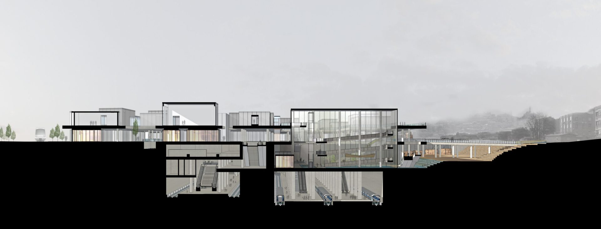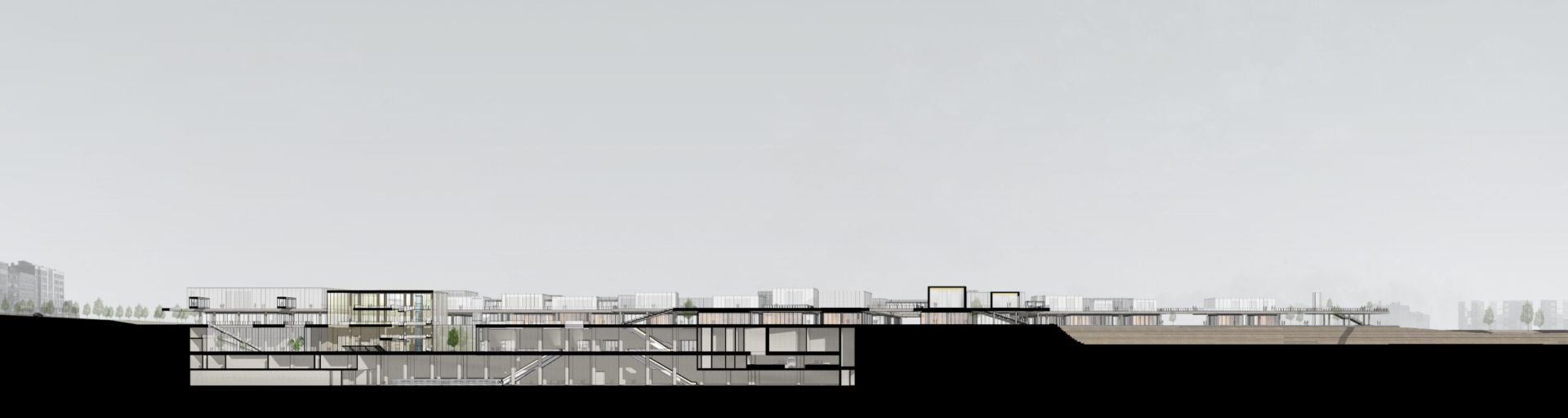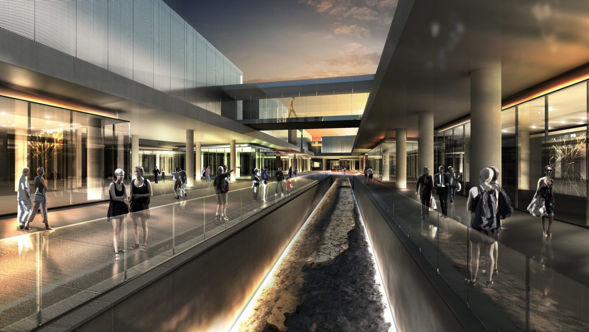 Unlike conventional museums, exhibition spaces of city archives are designed in fragments and spread over the canopy which is serving as a clear separator between the commercial activity on the ground level and the public space on archives level. In the Transfer Center while one transfers between stations; to meet the empty space where the port remains are, to see the entrance gallery of the city museum and the commercial buildings, to have a visual relation with the above-ground enables a perception of being in a “place”.